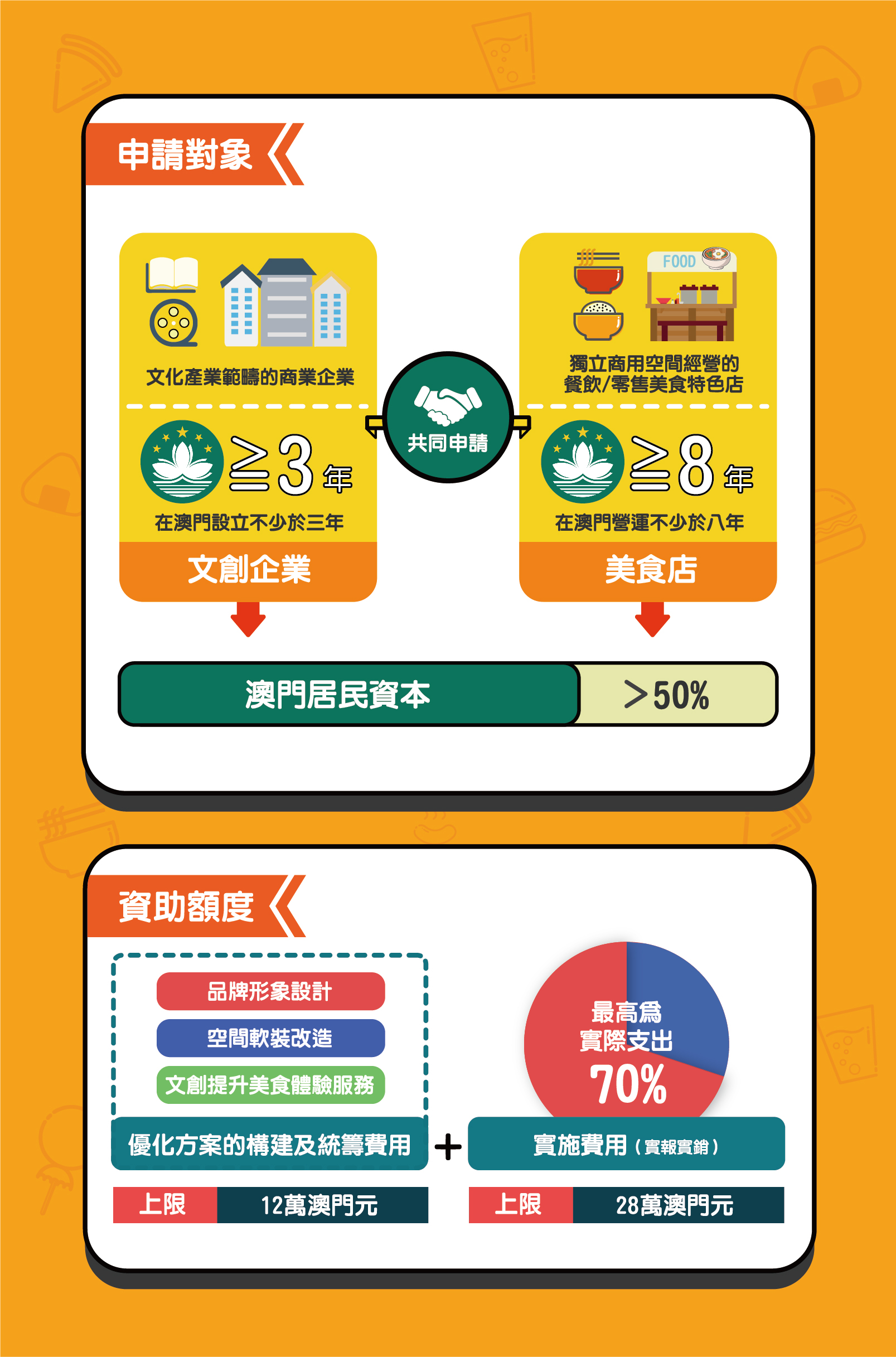 申請須由文創企業及社區美食店共同提出,專項計劃要求文創企業在澳門設立不少於3年、美食店在澳門營運不少於8年,且在獨立的商用空間經營餐飲或食品零售。上述文創企業及社區美食店須由澳門居民持有50%以上的資本,才符合申請資格。