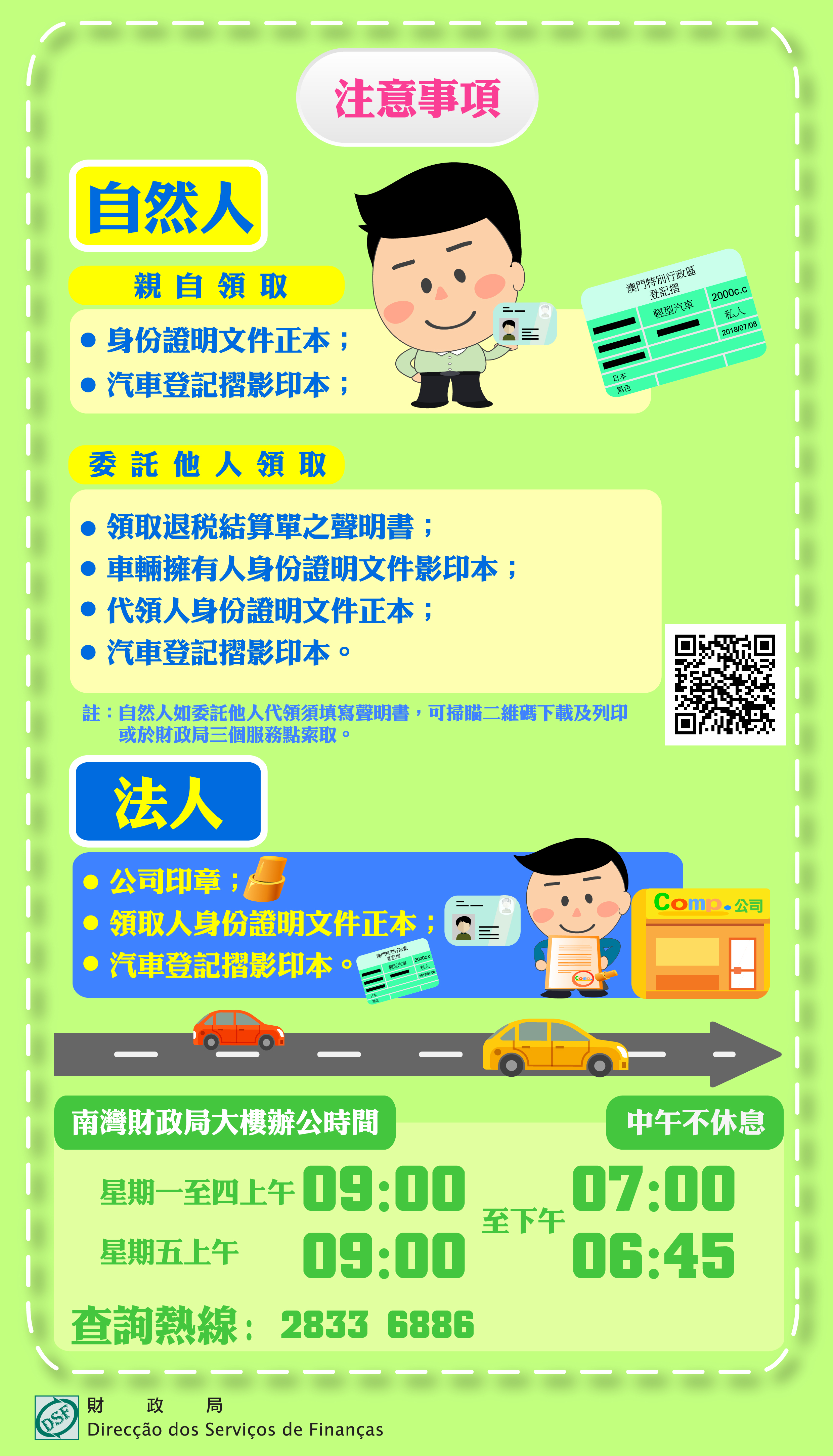相關車輛擁有人自7月14日起可透過交通事務局網頁 www.dsat.gov.mo 查詢領取退稅結算單日期,並盡量於指定日期或之後攜同下列所須文件到南灣財政局大樓領取。倘未及於指定日期領取,輪候時間將會增長。