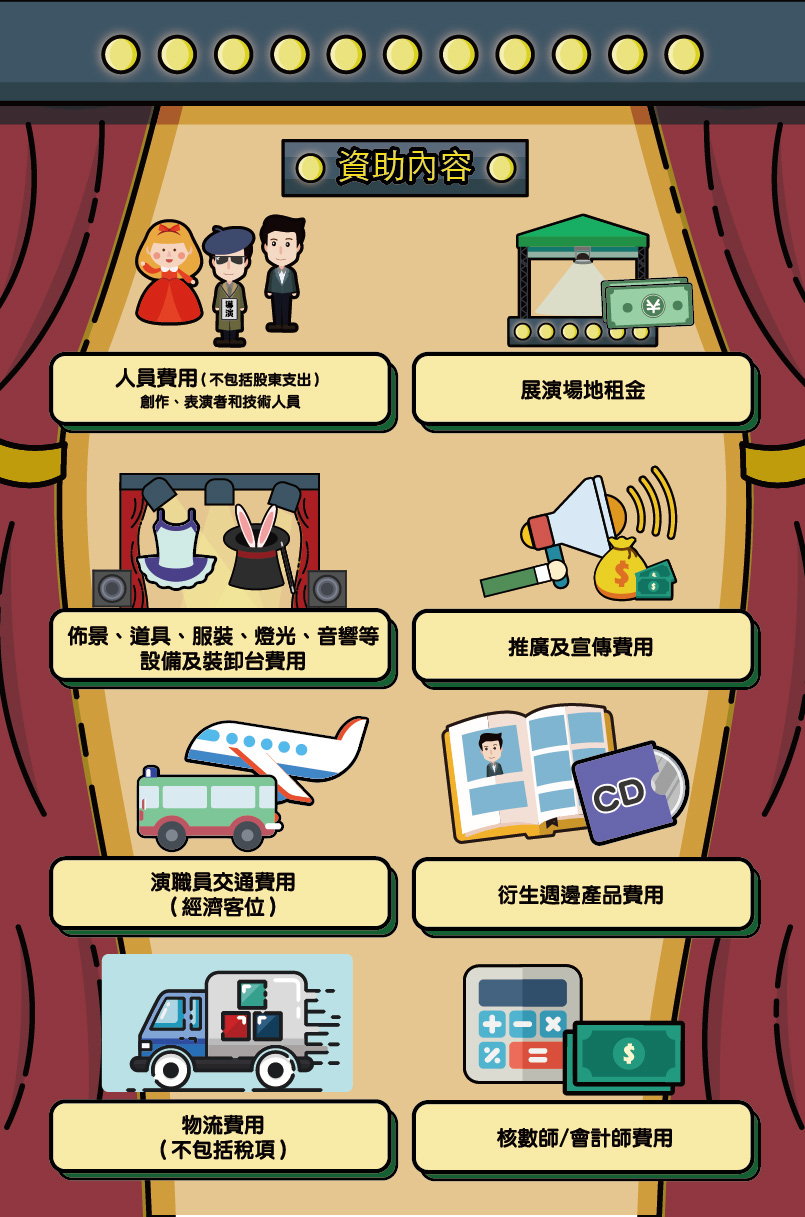 基金將擇優選拔申請項目;本期計劃資助名額10個,項目執行期18個月,資助額度為項目總支出的90%,上限為80萬澳門元。資助款項的應用範圍包括:創作、表演及技術人員的人事費用;展演場地租金;佈景、道具、服裝、燈光、音響等設備及裝卸舞台費用;推廣及宣傳費用;演職員交通費用(指定規格);衍生周邊產品費用;物流費用及核數師/會計師費用。基金以實報實銷形式對企業作出資助,資助款項須以封閉式專用帳戶管理,並經核數公司審核帳目,以確保公帑的有效運用。有意申請的企業可透基金過網頁(www.fic.gov.mo)下載申請表格,如有疑問,歡迎致電2850 1000或電郵info@fic.gov.mo查詢。