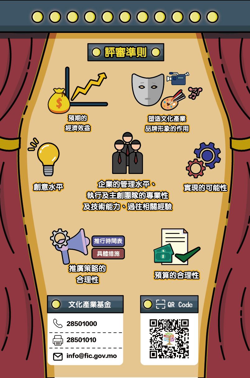 評審將根據申請項目預期的經濟效益、對塑造文化產業品牌形象的作用、創作水平、項目實現的可能性、推廣策略(包括推行時間表及具體措施)的合理性、預算的合理性、申請企業管理水平、執行團隊技術能力及過往相關經驗作為評審準則。