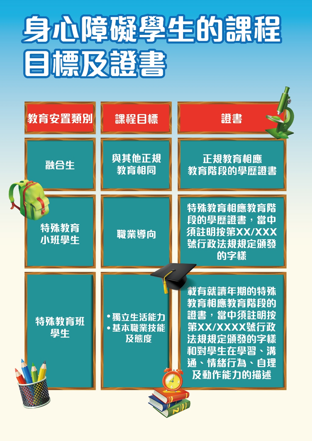 對於有身心障礙的學生,法規區分了融合生、特殊教育小班學生和特殊教育班學生共三個類別。融合生在普通班就讀;特殊教育小班可於普通學校或特殊教育學校各教育階段開設;特殊教育班按年齡劃分為幼兒、小學、初中及高中教育階段。融合生的課程目標與正規教育基本相同;特殊教育小班學生的課程旨在使學生擁有從事某一職業所需的基本知識、能力及態度;特殊教育班學生的課程則旨在培養學生的獨立生活能力、基本職業技能及態度。