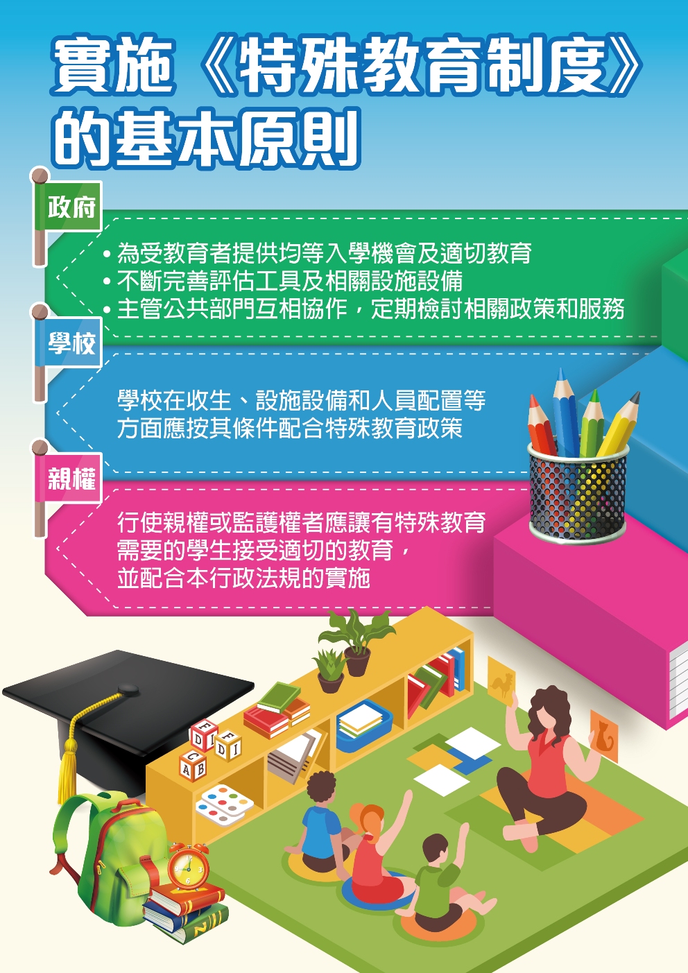 訂定特殊教育應遵守的基本原則,以及評估有特教需要學生的準則,包括須用多元評量原則,使用標準化評量工具,以及考慮學生的成長背景及學習經驗等。