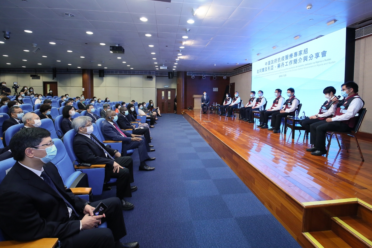 會上,擔任專家組團長的重慶市衛生健康委員會周林副主任介紹了在阿、蘇兩國抗疫工作的情況,並代表專家組感謝中央政府、澳門特區政府、重慶市政府及所有部門,駐阿、蘇兩國大使館對醫療隊援外工作的大力支持,讓專家組順利完成任務;並介紹了中非醫療合作的的歷史、中非間深厚的友誼,專家組組建的過程與特色。分享會上,各專家組成員亦分別與與會嘉賓及傳媒分享在援外任務中,個人的心路歷程及在執行任務期間的種種見聞。
