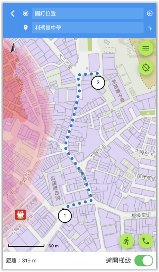 《應急地圖通》3.0版本新增了預先規劃步行至最近避險中心路線功能,一鍵即可清晰顯示所在位置至最近的避險中心之步行路線,讓市民可預先做好規劃,安排避險步行路線;此外,應用程式提供了“避開梯級”的功能,亦可於地圖上直接查詢兩點間避開梯級的步行路線,滿足市民的使用需求。