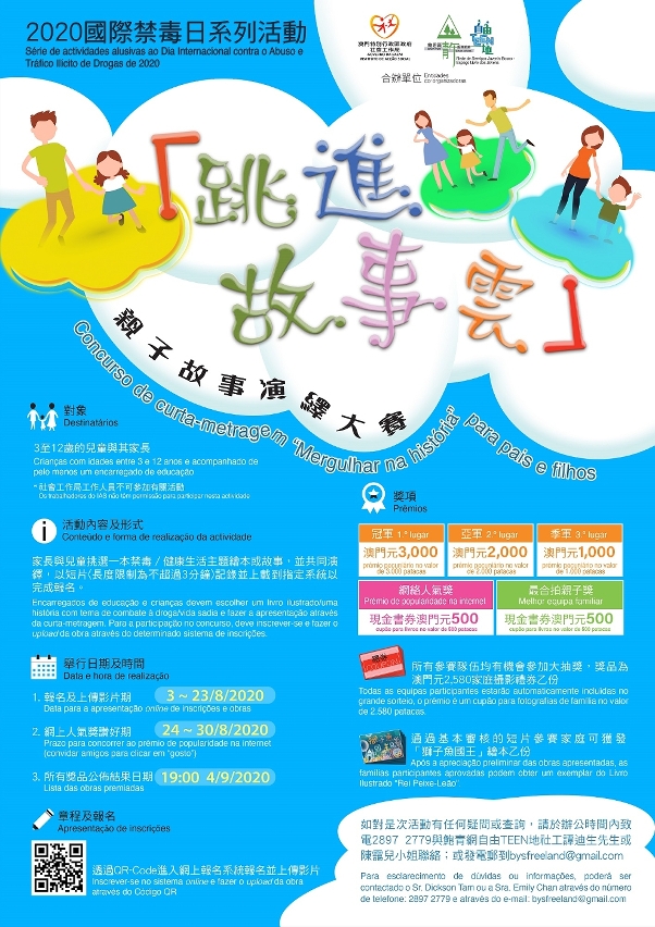 「跳進故事雲」 - 親子故事演繹大賽的活動目的,為增強兒童對毒品及偏差行為的抗逆力,透過故事演繹增進親子互動關係。是項比賽歡迎年齡3至12歲兒童和家長,挑選一本有關禁毒或健康生活主題的繪本或故事,共同演繹及錄製一段不超過3分鐘的短片,在8月3日至23日期間上載到指定網站報名參賽,比賽設有冠軍、亞軍、季軍,獎金分別為3,000澳門元、2,000澳門元和1,000澳門元,另外設有「最合拍親子奬」及「網絡人氣奬」可獲得禮券,所有通過評審的參賽家庭均可獲贈「獅子魚國王」繪本乙本;參賽者同時亦可參加大抽獎贏取家庭攝影禮劵乙份。評審後的參賽短片將上載Facebook「跳進故事雲」專頁,比賽結果將於本年9月4日晚上7時在專頁公佈,敬請留意。