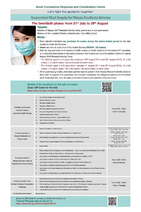 新型冠狀病毒感染應變協調中心今(29)日公佈,第二十輪保障口罩供應澳門居民計劃於週五(31)日開始。為方便市民,當局調整口罩售賣期間至30日,即第二十輪計劃由7月31日至8月29日,期間每人一次性購買30個口罩,售價維持每個0.8澳門元,即共24澳門元。應變協調中心強調,特區政府保證口罩供應充足,市民在第二十輪計劃期間的任何時間都可購買到口罩,呼籲市民毋需急於首兩日前往購買,以避免人群聚集,屆時亦無需長時間輪候,希望市民配合。
