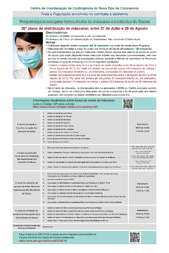 第二十輪計劃的售賣點及時間與第十九輪相同。而計劃的對象為本澳永久及非永久居民、持外地僱員身份認別證(俗稱藍咭)人士;衛生局轄下衛生中心及衛生站、衛生局協議藥房、本澳三個社團(工聯、街總、婦聯)繼續提供售賣口罩服務,即全澳共有84個售賣點,詳情見附圖。