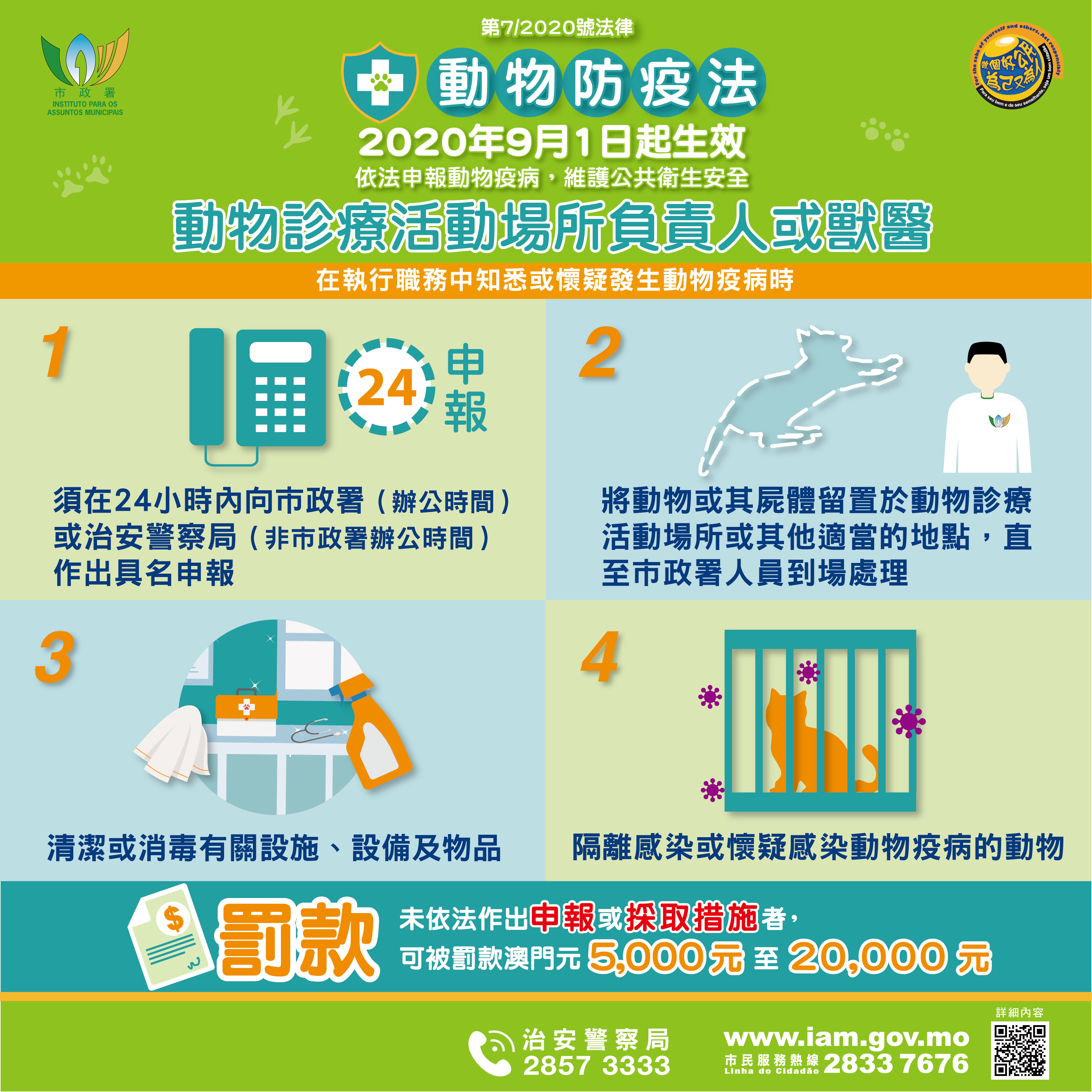 動物疫病與人的關係越趨密切,動物疫病能早期發現及通報,將可更有效地應對突發的動物公共衛生事件。《動物防疫法》規定公共或私人動物診療活動場所負責人或獸醫,在執行職務中知悉或懷疑發生動物疫病時,須在二十四小時內向相關權限實體市政署或治安警察局作出具名申報,未依法作出申報可被罰款五千至二萬澳門元。而市政署目前正制訂本澳的《動物疫病名錄》及申報表格,稍後將透過行政長官批示公布及上載至網站,以便業界了解須作強制性申報之疫病,有需要時填寫申報。