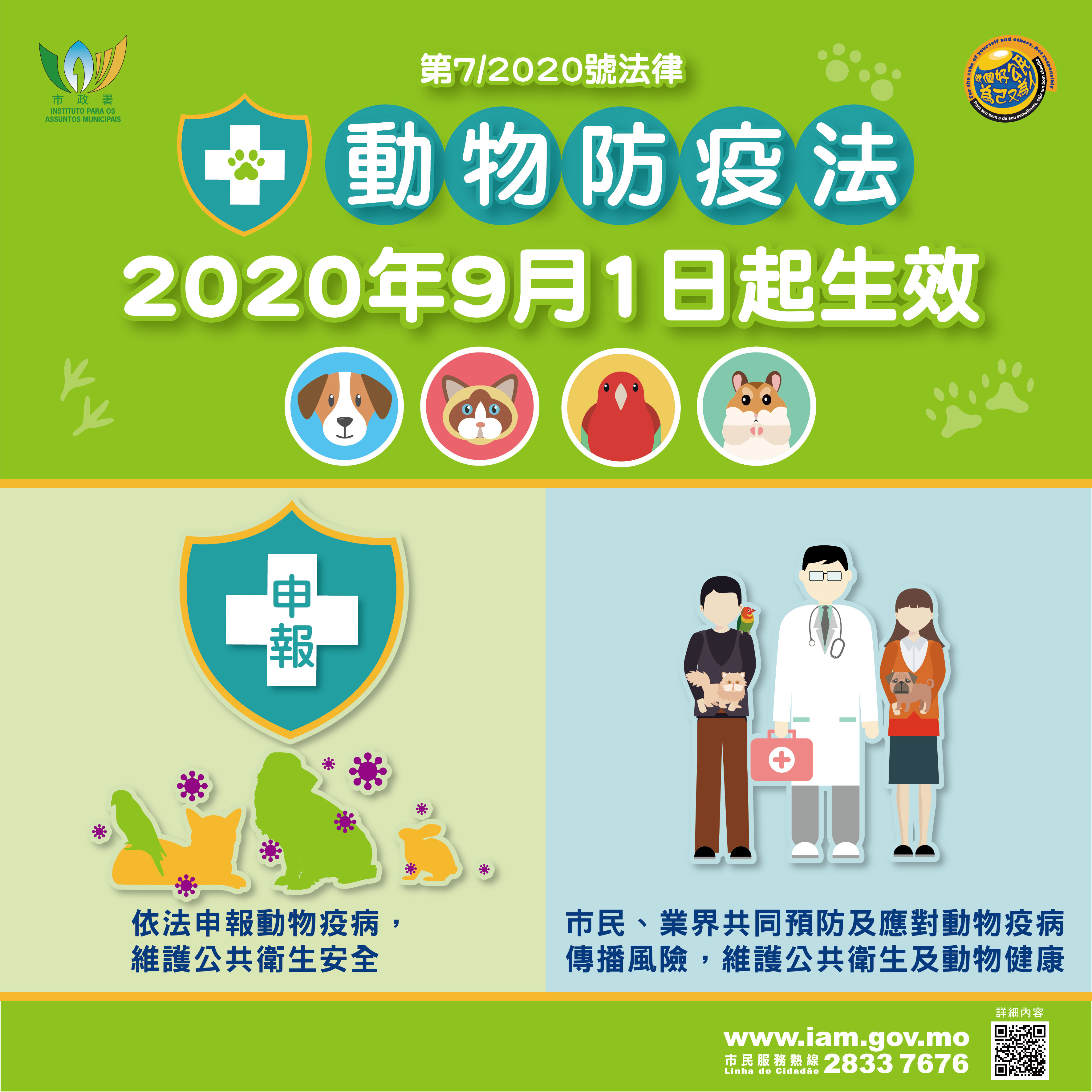 配合《動物保護法》的全面實施,提高本澳動物衛生水平,澳門特區政府制訂了第7/2020號法律《動物防疫法》,對預防及應對動物疫病傳播風險的管制措施作出法律規範,法律將於本年九月一日生效。