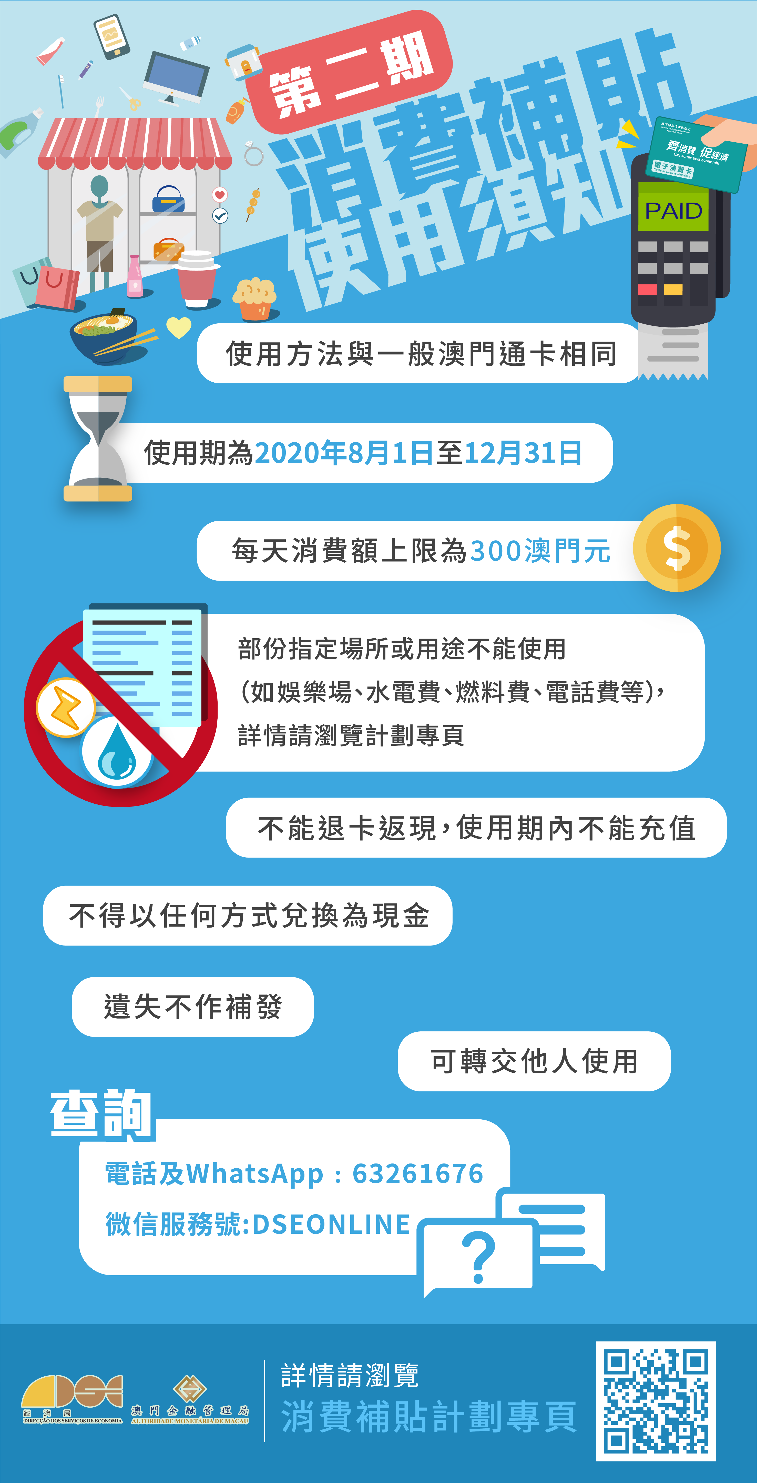 • 如對消費卡的使用存有疑問或發現不規則使用情況,歡迎透過消費補貼熱線6326 1676聯絡經濟局。