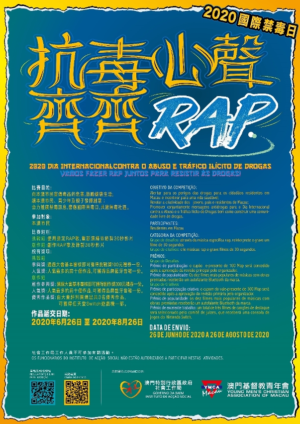 由社會工作局與澳門基督教青年會合辦的「抗毒心聲齊齊RAP」活動,將於8月26日截止收件,而網上投票將於9月9日截止,歡迎有興趣的市民踴躍參與。