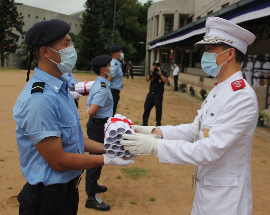 結業典禮上,學員踏着鏗鏘的步伐進場,在炎陽下列隊肅立,展現了高度的紀律性和昂揚意志,隨後由校長黃子暉、副校長林壘立及各主管向學員頒發結業證書及各獎項,以肯定學員的學習成果以及出色的表現;最後由學員們進行結業花式槍演練,學員們持槍動作俐落、整齊劃一,可見平日訓練有素,呈現了部隊團結一致的精神。