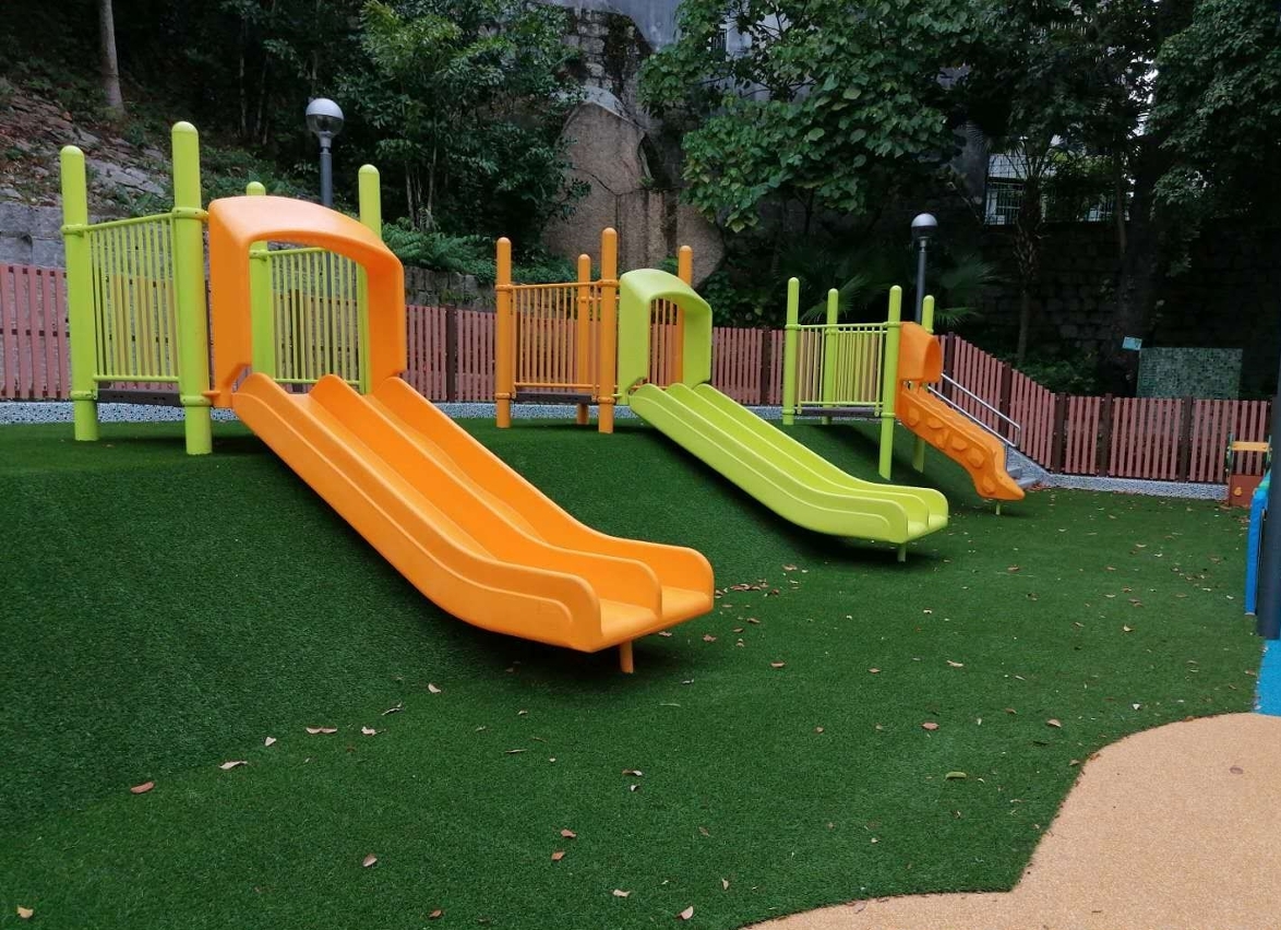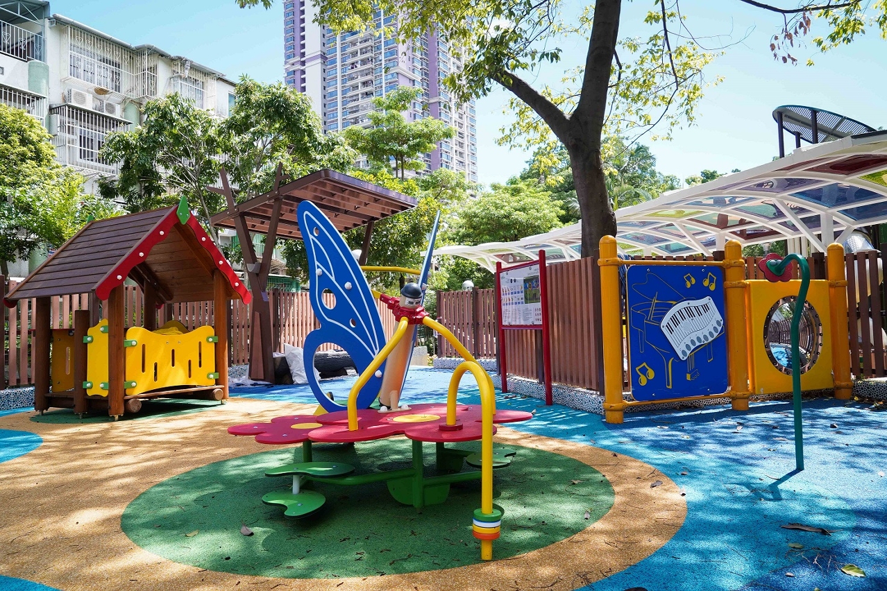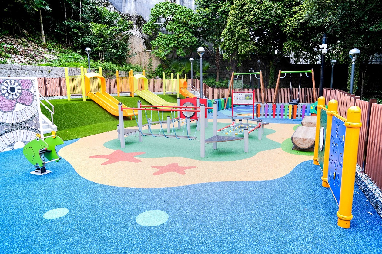 小童遊樂區以花卉為裝飾主題,設有花朵造型綜合遊戲架及訓練體能的遊樂設施,同時設有親子鞦韆,並利用自然坡度設置人造草地滑梯區,小童可自由選擇利用滑梯或滑草方式返回平地,藉以增加親子之間的互動及趣味性。牆身以馬賽克拼湊出花卉圖案,呼應場地主題。