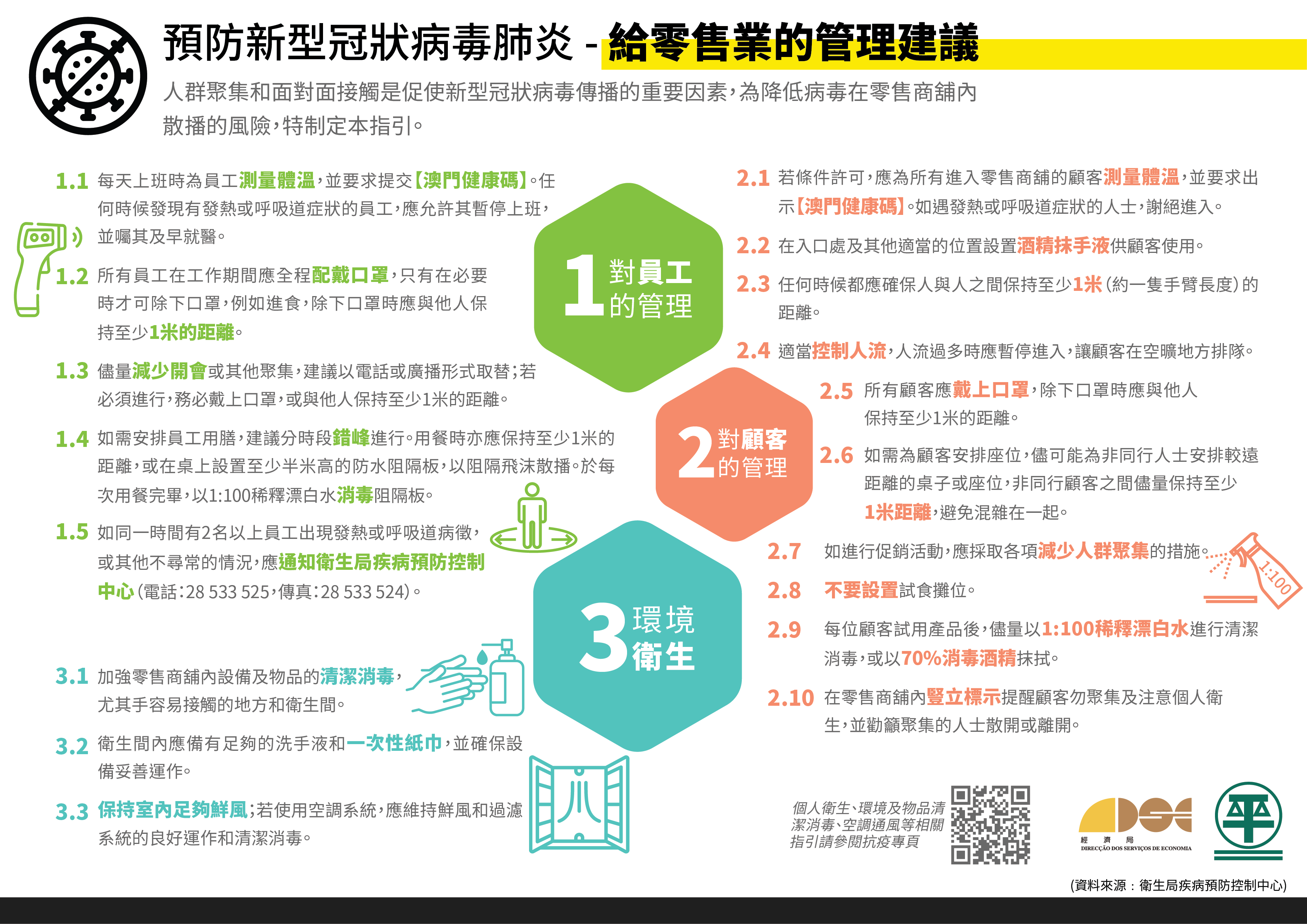 為應對市面零售場所可能出現人流增加的情況,經濟局及消委會自上月起約見多個商會以及到各區商戶介紹零售業防疫指引,至今已向超過1,500間零售場所派發相關宣傳品供業界參照使用。詳細資料亦可瀏覽衛生局“抗疫專頁”(https://www.ssm.gov.mo/apps1/PreventCOVID-19/ch.aspx#clg17668)及下載相關指引。