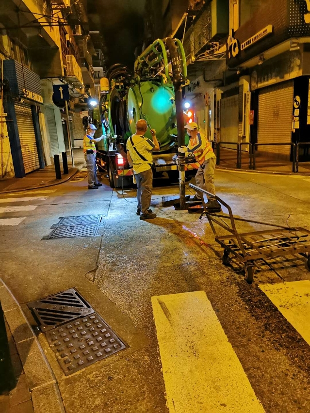 本澳受熱帶風暴「海高斯」影響,天氣不穩,市政署加強渠道防範工作,加派人員檢查下水道、泵房,並進行清理,調派泵車加強疏通水浸黑點的渠道,確保渠道暢通,避免街道水浸。