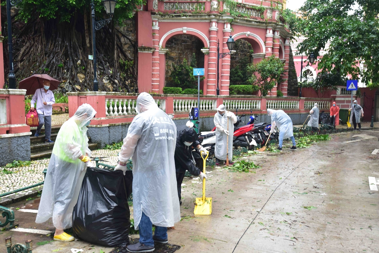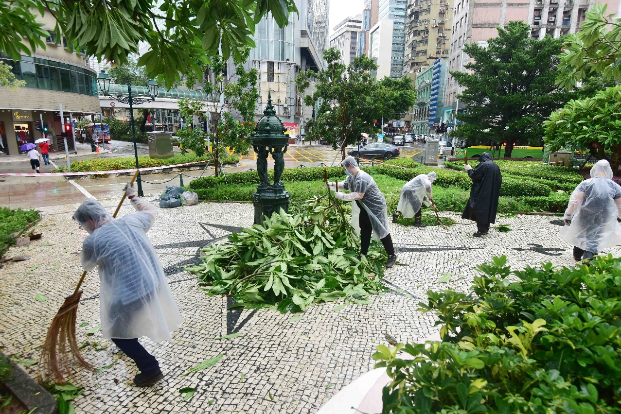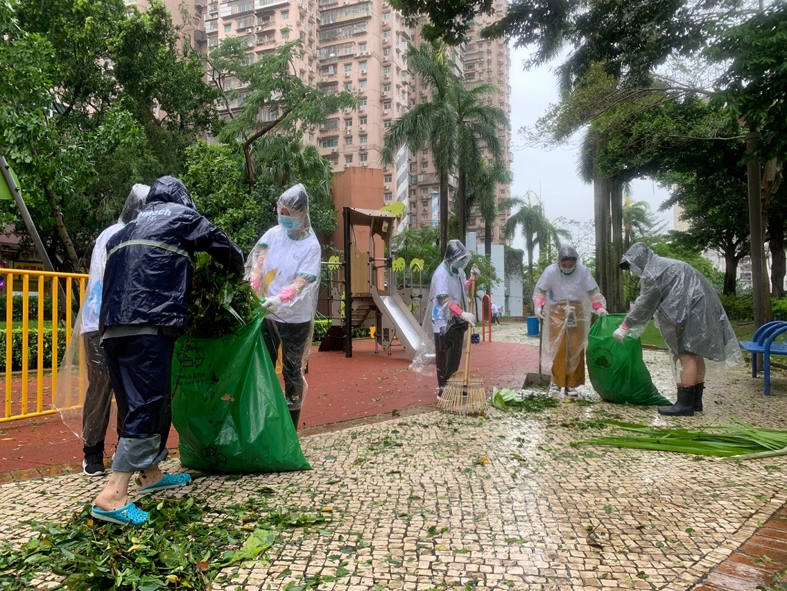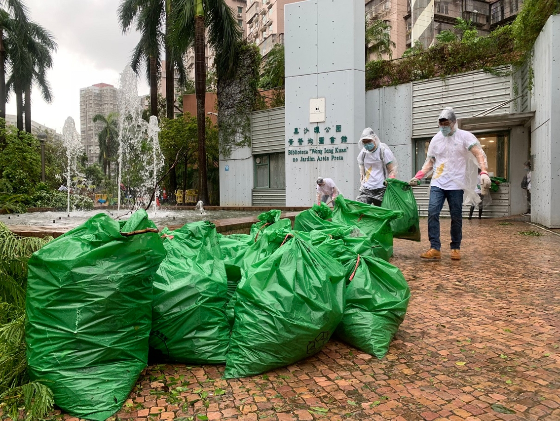 為加快推進風後清理工作,減輕前線人員工作負擔,盡快重新開放市政公園,公職局、法務局、市政署、身分證明局、印務局及退休基金會等行政法務部門組織六隊義工隊,今分別到黑沙環市政公園、氹仔花城公園、中央公園、南灣八角亭、嘉思欄公園、石排灣郊野公園、路環恩尼斯花園等進行清理工作,共同合力,讓有關設施盡快回復原面貌,供市民使用。