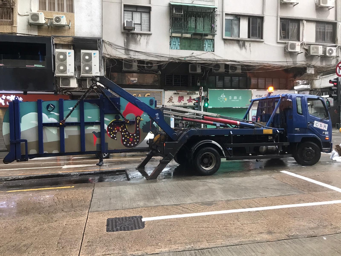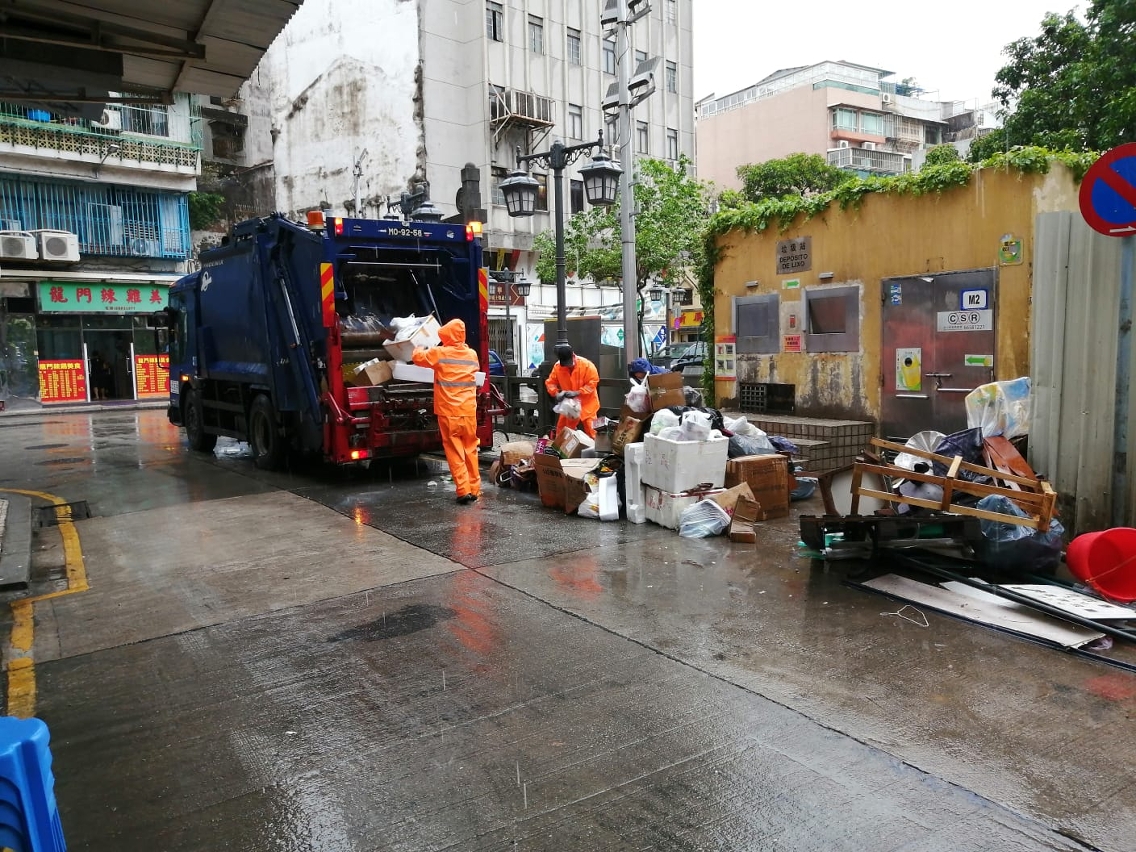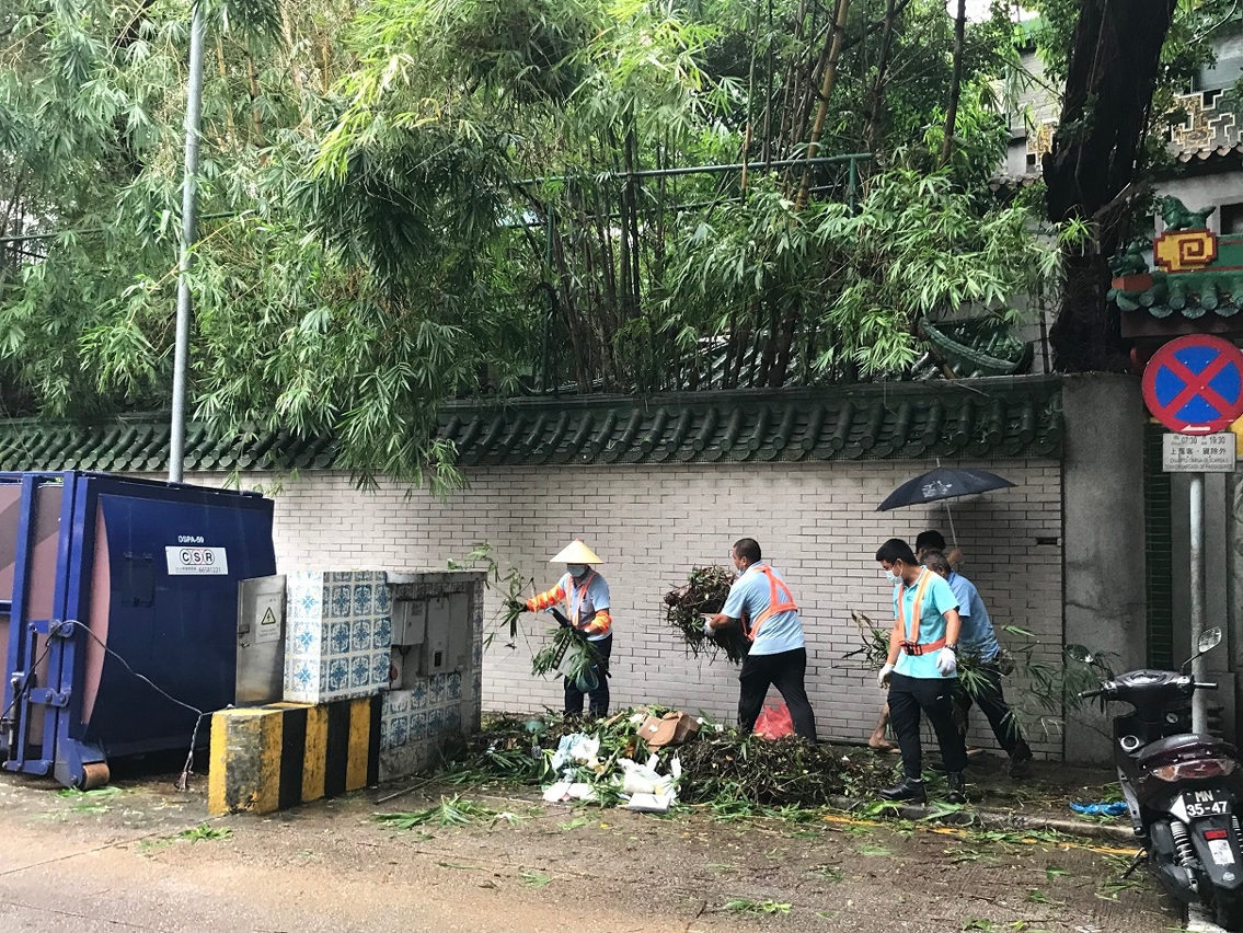 在垃圾清運方面,市政署協調清潔專營公司在懸掛八號風球前加緊街道垃圾收集工作;在八號風球除下後,清潔專營公司隨即額外增加一倍運載力到各區收集垃圾及跟進清理街道工作,共派出16台垃圾車及7台壓縮桶吊運車進行垃圾清運工作,截至下午二時所收集的垃圾量約104噸。
