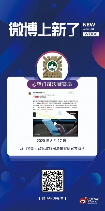 為配合多媒體資訊的發展,提升防罪宣傳工作的成效,司法警察局與時並進,近年致力拓展防罪宣傳渠道,透過網絡平台向社會大眾發放防罪滅罪及局方工作資訊。8月19日,司警局在著名網絡社交平台微博正式開通官方帳號“澳門司法警察局”,並已獲得微博官方藍V認證,透過平台加強向微博的受眾尤其是內地居民宣傳本澳的防罪滅罪等資訊,以提升在澳期間的防罪意識,亦藉此瞭解局方的日常警務工作。