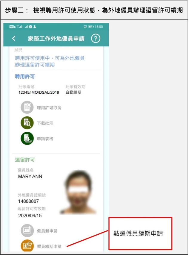 為進一步便利家務工作外地僱員續期,治安警察局經充分應用電子平台功能,將於2020年9月1日在“一戶通”手機應用程式上推出“家務工作外地僱員續期便捷領證服務”,減少家務工作外地僱員前來辦理的次數。僱主只要使用“一戶通”應用程式辦理家務工作外地僱員續期申請,並透過該程式繳納辦證費用,家務工作外地僱員即可在10天(非工作天)後到所選地點(包括:北安出入境事務大樓、黑沙環新街政府綜合服務大樓或離島政府綜合服務中心),同時領取新的“僱員身份的逗留許可”憑條及《外地僱員身份認別證》。