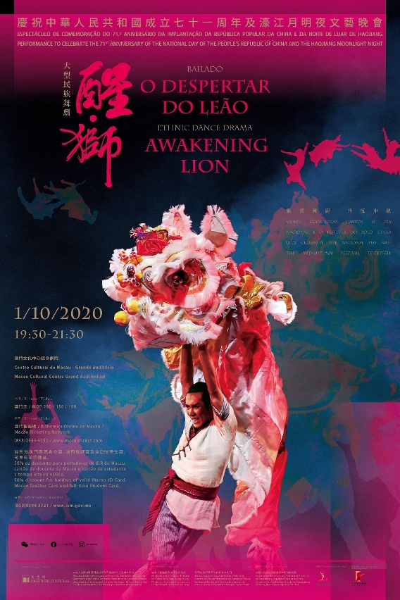 為慶祝中華人民共和國成立七十一周年及與巿民共度中秋佳節,由澳門特別行政區政府文化局及中央人民政府駐澳門特別行政區聯絡辦公室宣傳文化部主辦,中華人民共和國文化和旅遊部及澳門特別行政區政府社會文化司支持,中華人民共和國廣東省文化和旅遊廳承辦,廣州巿文化廣電旅遊局協辦,並由廣州歌舞劇院擔演的“慶祝中華人民共和國成立七十一周年及濠江月明夜文藝晚會-大型民族舞劇《醒•獅》”,將於10月1日晚上7時30分在澳門文化中心綜合劇院上演,門票於本周四(9月3日)起在澳門售票網公開發售。
