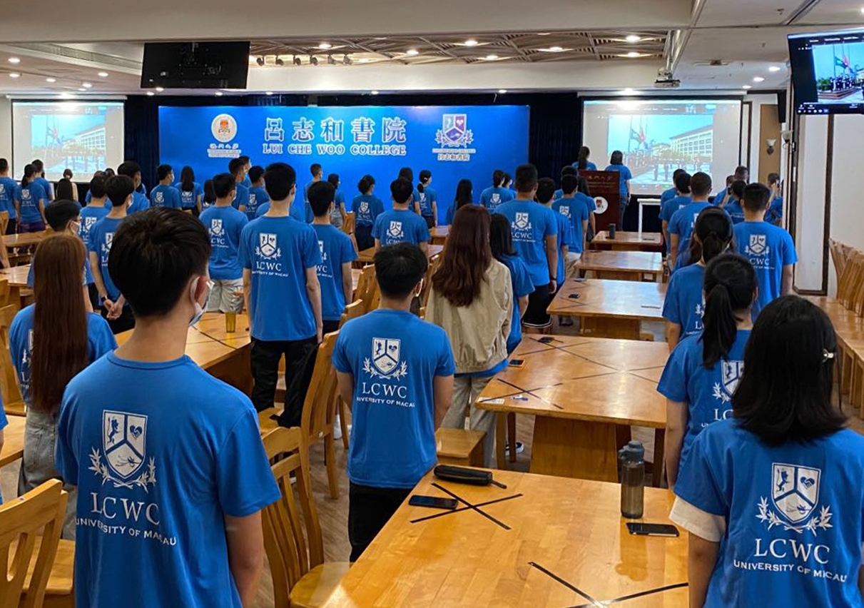 按照澳門特區政府衛生局在疫情下的指引,為免人流聚集,各書院選派學生代表出席,現場有100多名澳大師生代表於澳大蓮花廣場觀禮,其他師生和教職員亦透過網上直播實時參與,見證新學年的開始。20名澳大國旗儀仗隊隊員護送中華人民共和國國旗、澳門特別行政區區旗和澳門大學校旗,在指揮員的口令下踏著鏗鏘的步伐,整齊有序地邁向升旗台。當國旗手、區旗手和校旗手一起拋出手中的旗幟,雄壯的國歌響砌蓮花廣場上空,同時也在師生們的屏幕前奏響。