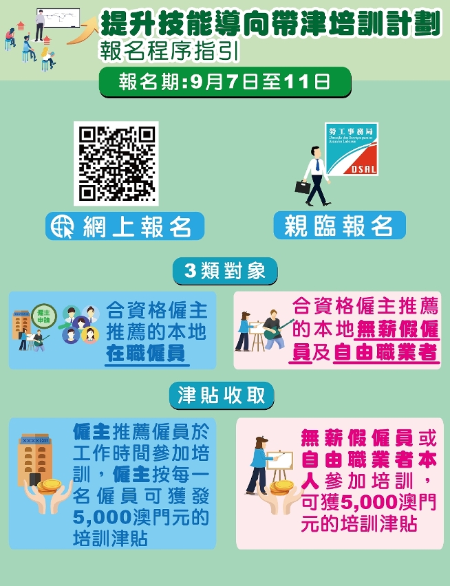 勞工事務局根據第33/2020號行政法規,為合資格僱主所推薦的僱員及自由職業者推出的“提升技能導向帶津培訓計劃”,首輪課程於今日起至九月十一日接受報名。
