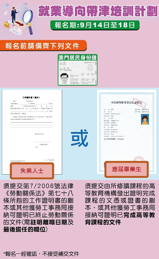 根據第33/2020號行政法規,於二零一九年一月一日或之後因勞動關係終止而失業的人士,以及非處於受僱狀態的二零二零年高等院校畢業生,均符合條件報讀“就業導向帶津培訓計劃”。