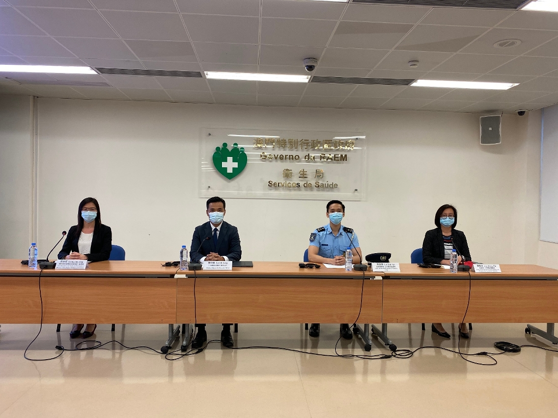 新型冠狀病毒感染應變協調中心於今(14)日舉行例行記者會,仁伯爵綜合醫院羅奕龍醫務主任、治安警察局公共關係處李德輝處長、旅遊局公共關係處劉鳳池處長、疾病預防控制中心傳染病防制暨疾病監測部梁亦好協調員共同會見傳媒。