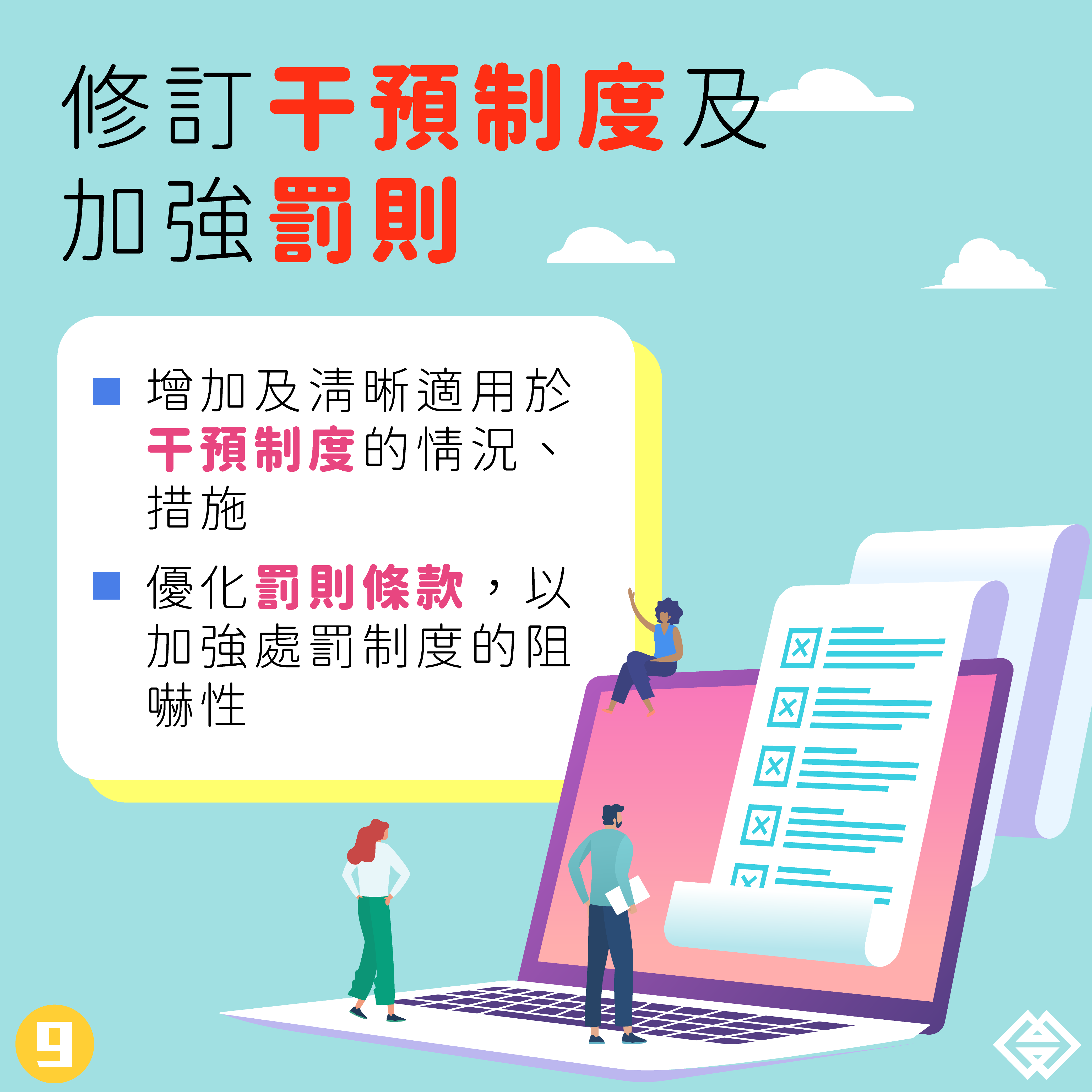 四、 修訂干預制度及加強罰則,增加及清晰適用於干預制度的情況、措施及優化罰則條款,加強處罰制度的阻嚇性。