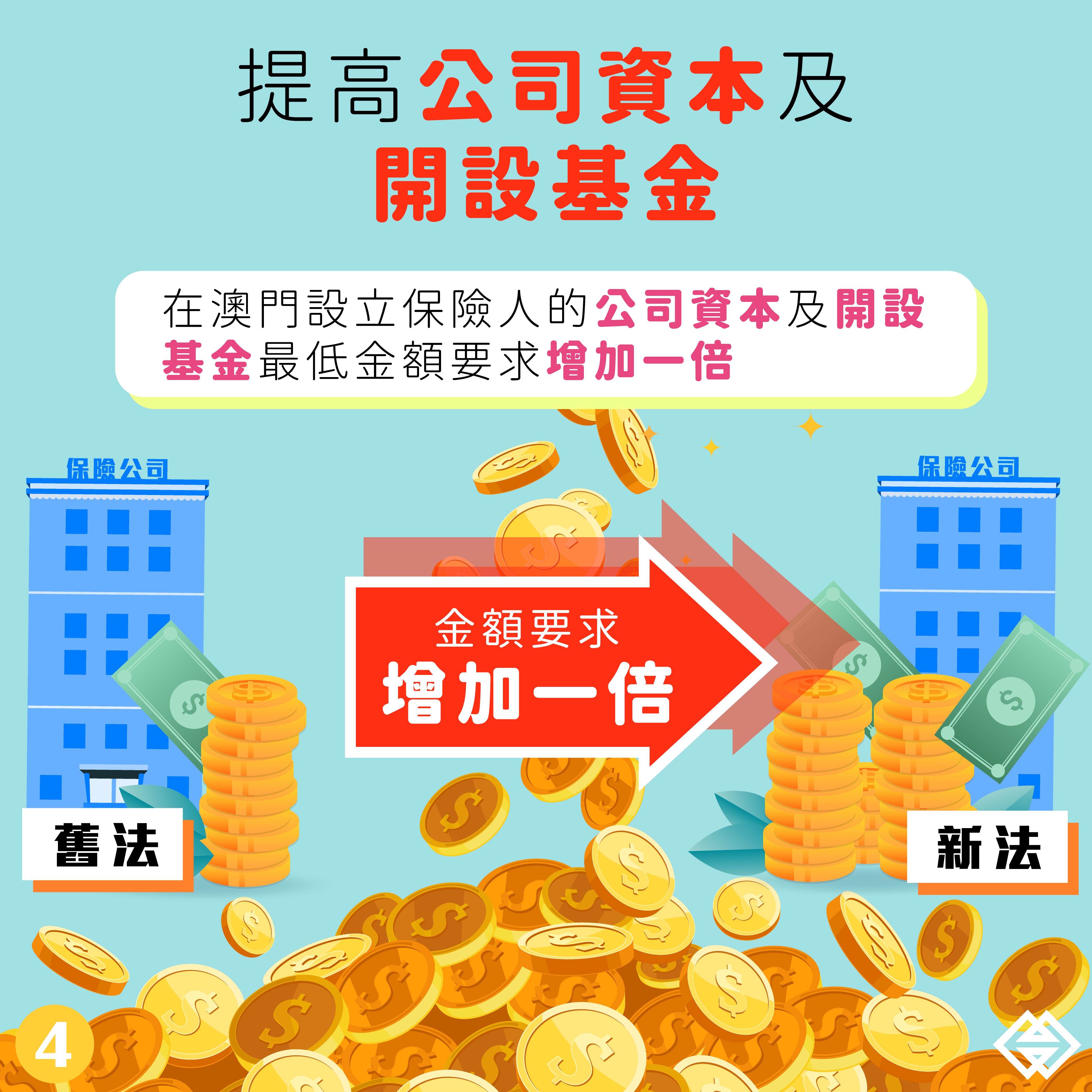 二、 提升資本及擔保要求,對現有保險人及申請人的資本金額要求提高一倍,並修訂技術準備金的要求,切實執行穩健經營的宗旨;