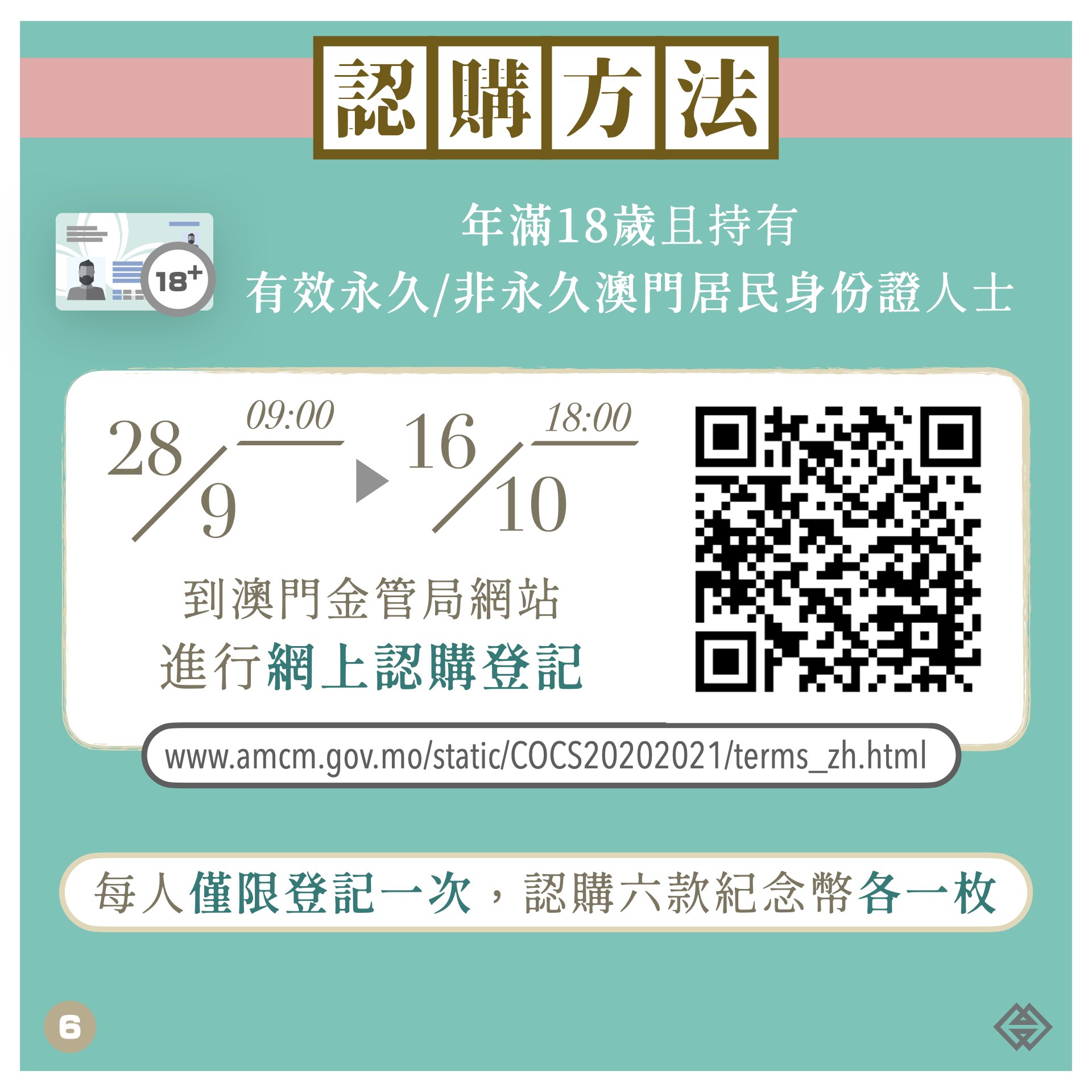 持有有效澳門居民身份證(包括永久及非永久)且年滿18歲的人士,可於9月28日上午9時正開始,到金管局網頁進行網上認購登記鼠年及牛年紀念幣(https://www.amcm.gov.mo/static/COCS20202021/terms_zh.html),登記期至10月16日下午6時正結束。在此期間,金管局大堂將設有專櫃,協助有需要的長者辦理登記認購手續。