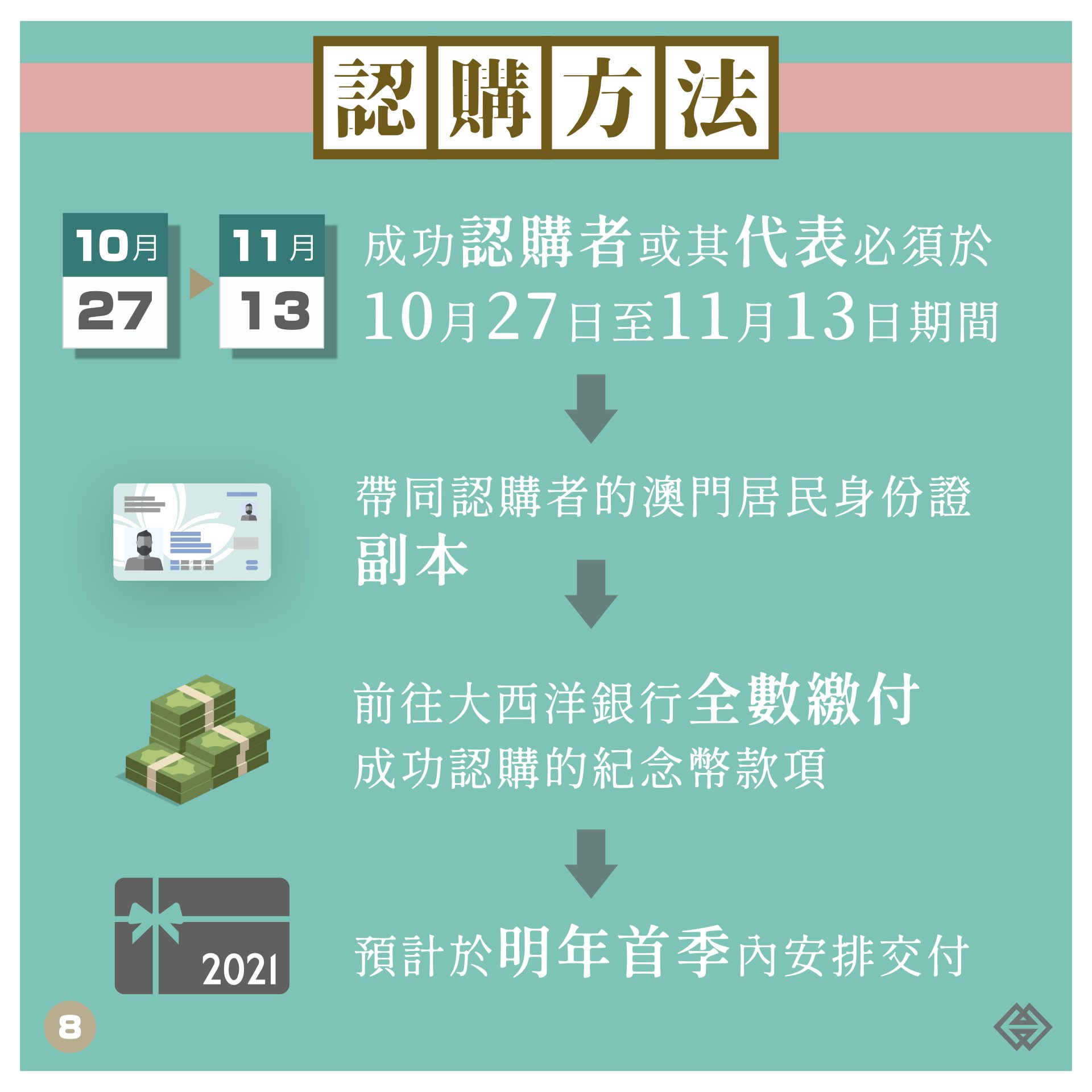 成功認購者或其代表須於10月27日至11月13日期間,帶同認購者的澳門居民身份證副本,前往大西洋銀行全數繳付成功認購的紀念幣款項。金管局預計於2021年第一季內安排紀念幣的交付。
