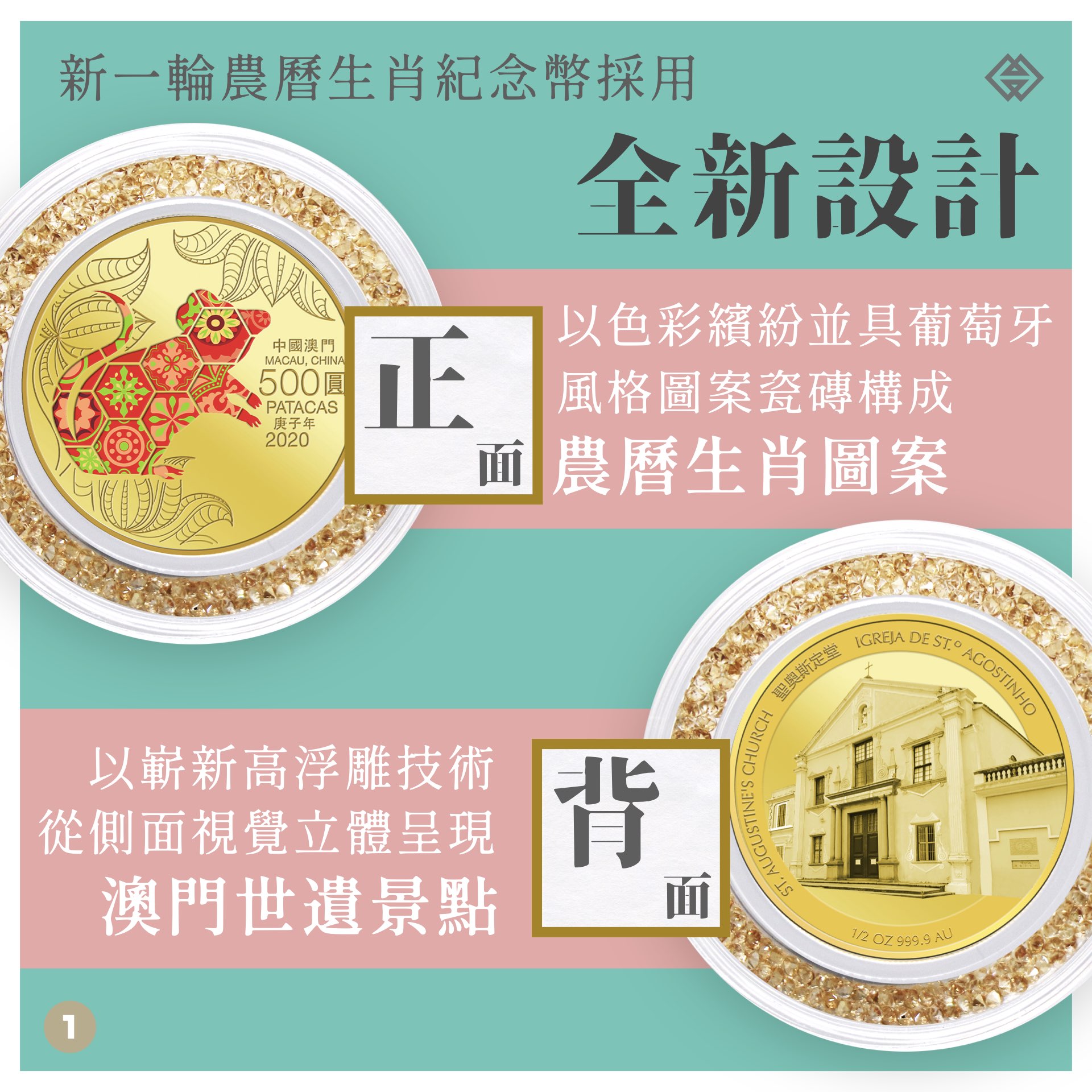新一輪農曆生肖紀念幣採用全新設計,正面以色彩繽紛且具葡萄牙風格的圖案瓷磚構成農曆生肖圖案,背面則以嶄新高浮雕技術,從側面視覺立體地呈現澳門世界文化遺產景點。與上系列相近,是次發行的鼠年及牛年生肖紀念幣將包括壹安士及五安士精裝銀幣,而精裝金幣則由過往的零點二五安士加重至零點五安士,三款紀念幣的售價分別為1,380澳門元、8,800澳門元及16,800澳門元。