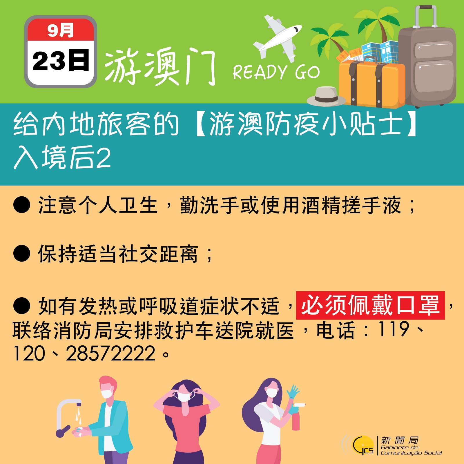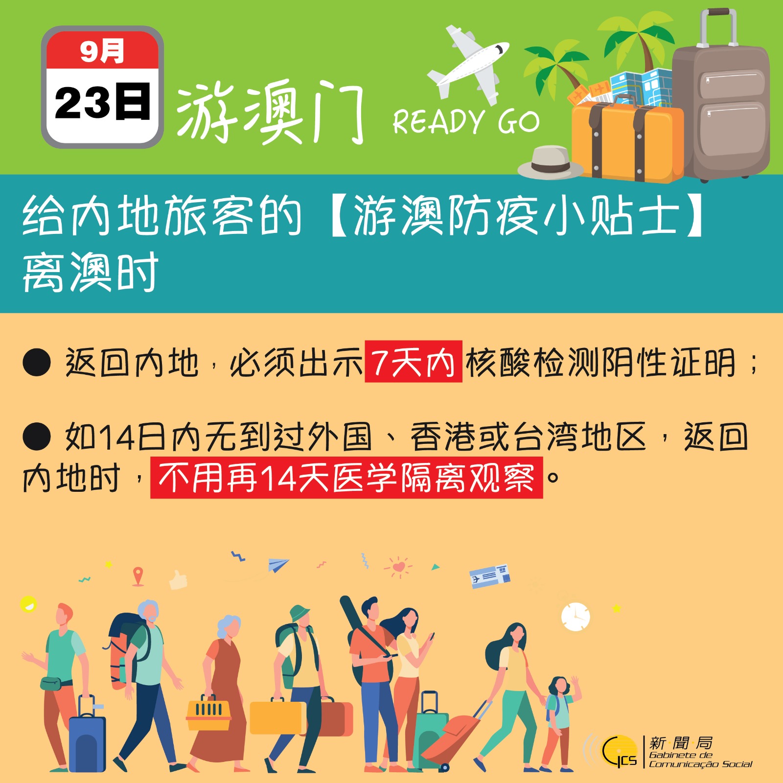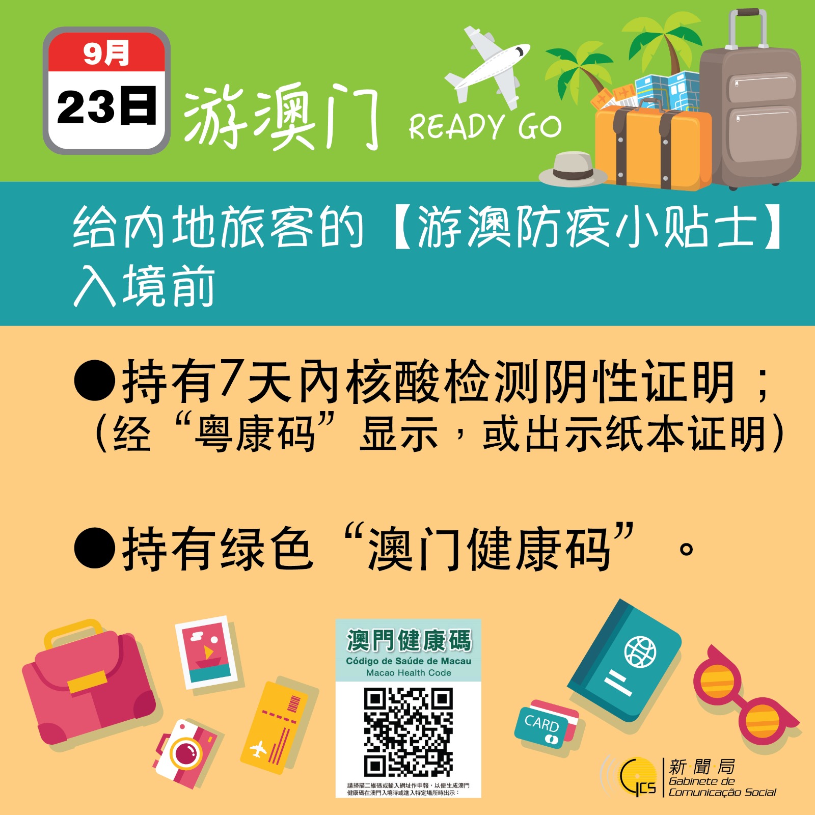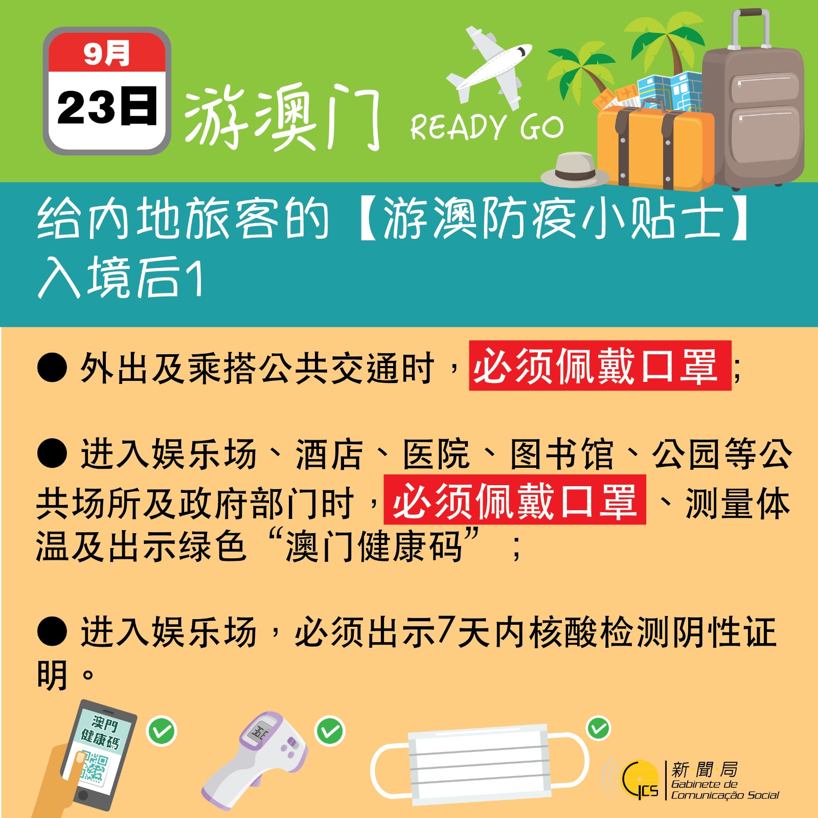 此外,因應全國恢復赴澳個人遊簽註及國慶十‧一黃金周,新聞局製作了“安心遊澳門”宣傳視頻及一系列圖文包,在各入出境口岸播放和展示,為旅客提供充足的防疫資訊,提醒他們抵澳後應注意的事項。
