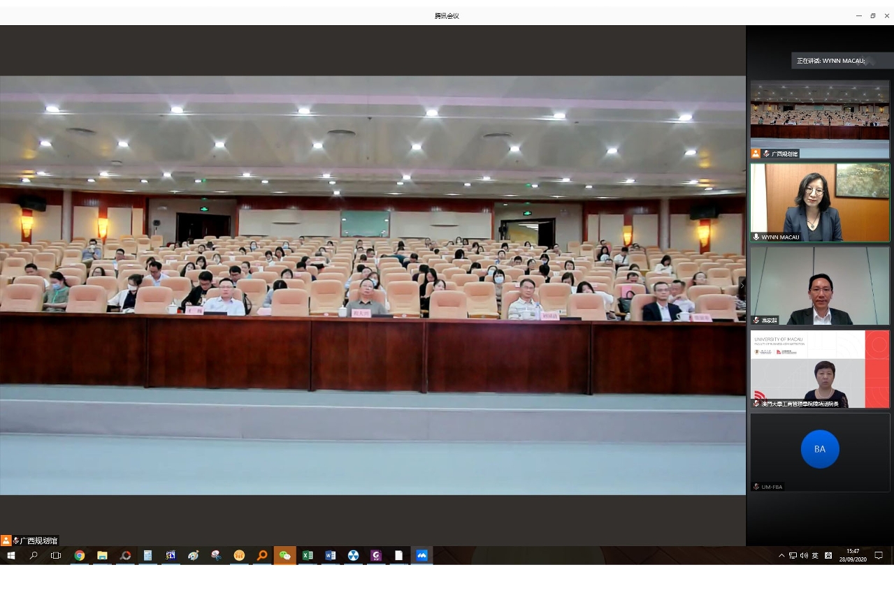 期間,澳大工商管理學院院長、商業研究與培訓中心主任陳靖涵教授致開幕辭及進行專題演講,從企業管理和公司治理的角度分享了她對企業如何增強“疫情免疫力”的看法。澳門特別行政區立法會議員、澳大工商管理學院博彩研究所所長馮家超教授,永利澳門及永利皇宮社區及政府關係行政總監徐秀玲、以及桂林旅遊學院國際教育交流學院院長張顯春在活動中分別就“澳門旅遊業的發展及新冠疫情後的反思”、“新冠疫情對世界旅遊業的影響及業界的對策—永利集團的經驗”、“新冠疫情對廣西的影響及對策”等專題進行演講。活動吸引100名來自廣西文化與旅遊行政部門主管人員、企業和高校代表參與。