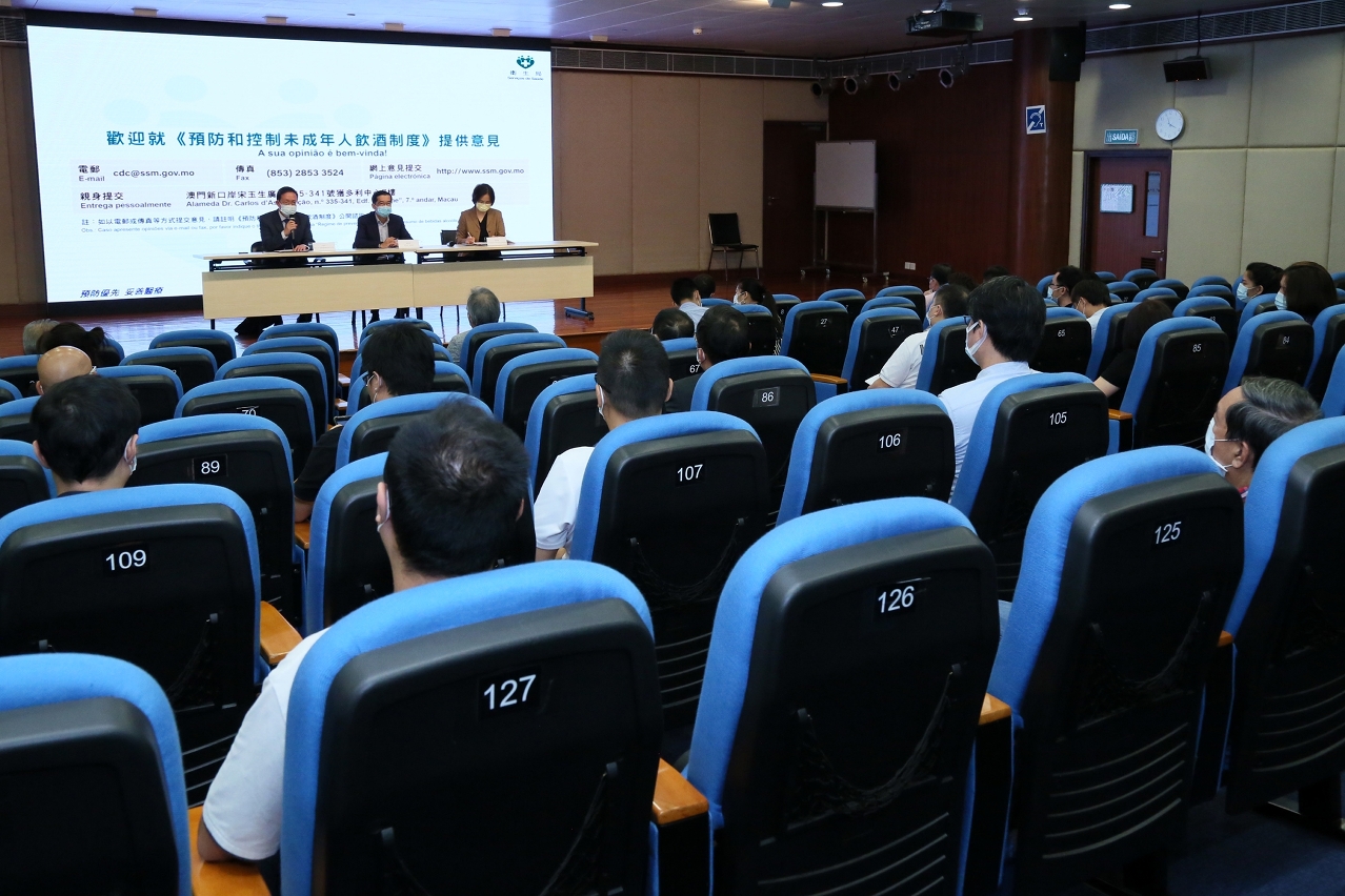 衛生局今(10)日於黑沙環衛生中心3樓演講廳舉行《預防和控制未成年人飲酒制度》首場諮詢專場,由衛生局鄭成業副局長主持,出席代表包括:法律辦公室夏利樂協調員、疾病預防控制中心林松主任及慢性病防制暨健康促進部陳丹梅協調員、預防及控制吸煙辦公室鄧志豪主任及柯慶建顧問醫生。首場諮詢專場為業界專場,對象為零售業、餐飲業、與酒類有關的行業組織,合共22個相關團體或機構約50名代表出席參與。