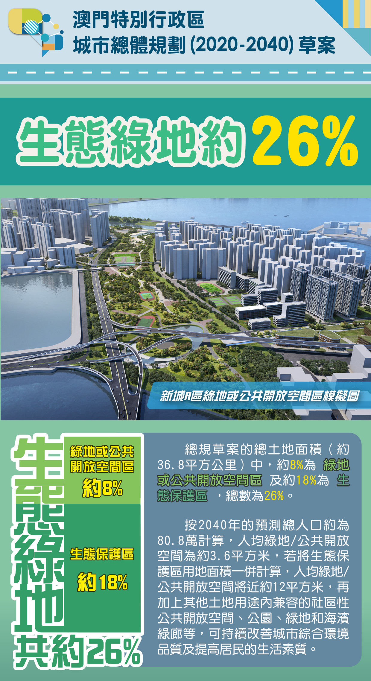 總規草案的總土地面積(約36.8平方公里)中,約8%為綠地或公共開放空間區及約18%為生態保護區,按2040年的預測總人口約為80.8萬計算,人均綠地/公共開放空間為約3.6平方米 (參考深圳與香港相關的規劃指標,兩地的人均公共開放空間標準為2平方米/ 人,而“香港2030+”亦提出人均公共開放空間標準增至為2.5平方米/人),若將生態保護區用地面積一併計算,人均綠地/公共開放空間將近約12平方米,再加上其他土地用途內兼容的社區性公共開放空間、公園、綠地和海濱綠廊等,確保澳門整體綠地或開放空間達到一定比例,持續改善城市綜合環境品質及提高居民的生活素質。