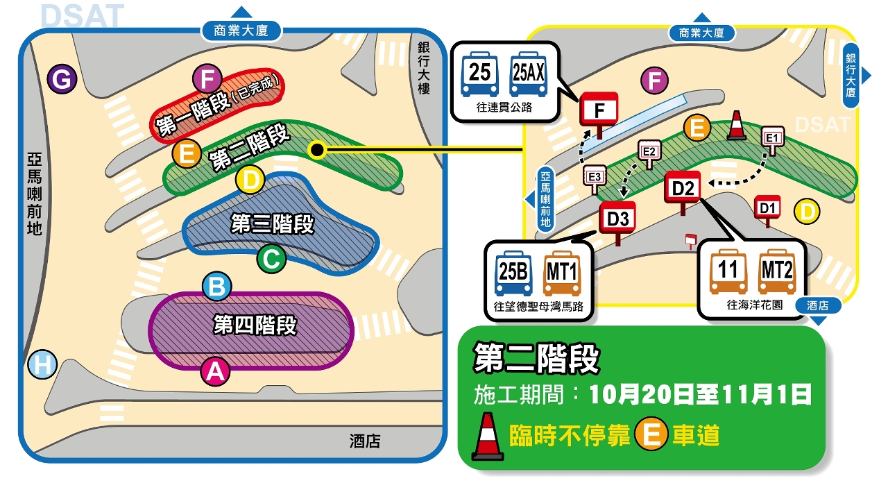 交通事務局現正分階段於亞馬喇前地巴士站增建總長度逾200米之雨篷,第二階段工程於10月20日(周二)展開,屆時將圍封E車道,途經該車道的巴士路線將臨時停靠D或F車道(詳見附表),而21A及26A恢復停靠F車道。