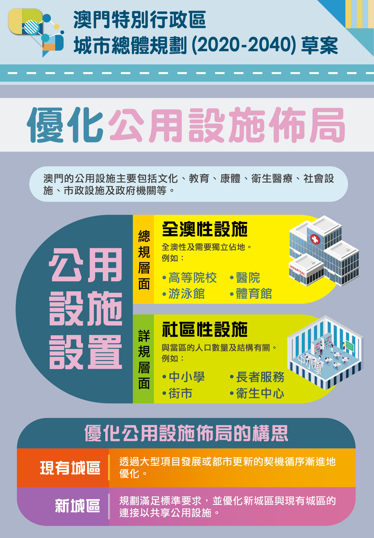 為持續提升居民綜合生活素質,應對經濟及社會發展、未來人口增長、人口結構老齡化等帶來的挑戰,《澳門特別行政區城市總體規劃(2020-2040)》草案提出優化本澳公用設施佈局,在總規的層面劃定全澳性且獨立佔地的文化、教育、康體、衛生醫療、社會設施、市政設施及政府機關等設施的區域為公用設施區,並提出透過建設複合利用的公用設施、提升其可達性及連接性、擴大服務覆蓋範圍,提高城市綜合功能,打造宜居城市,建設澳門美麗家園。