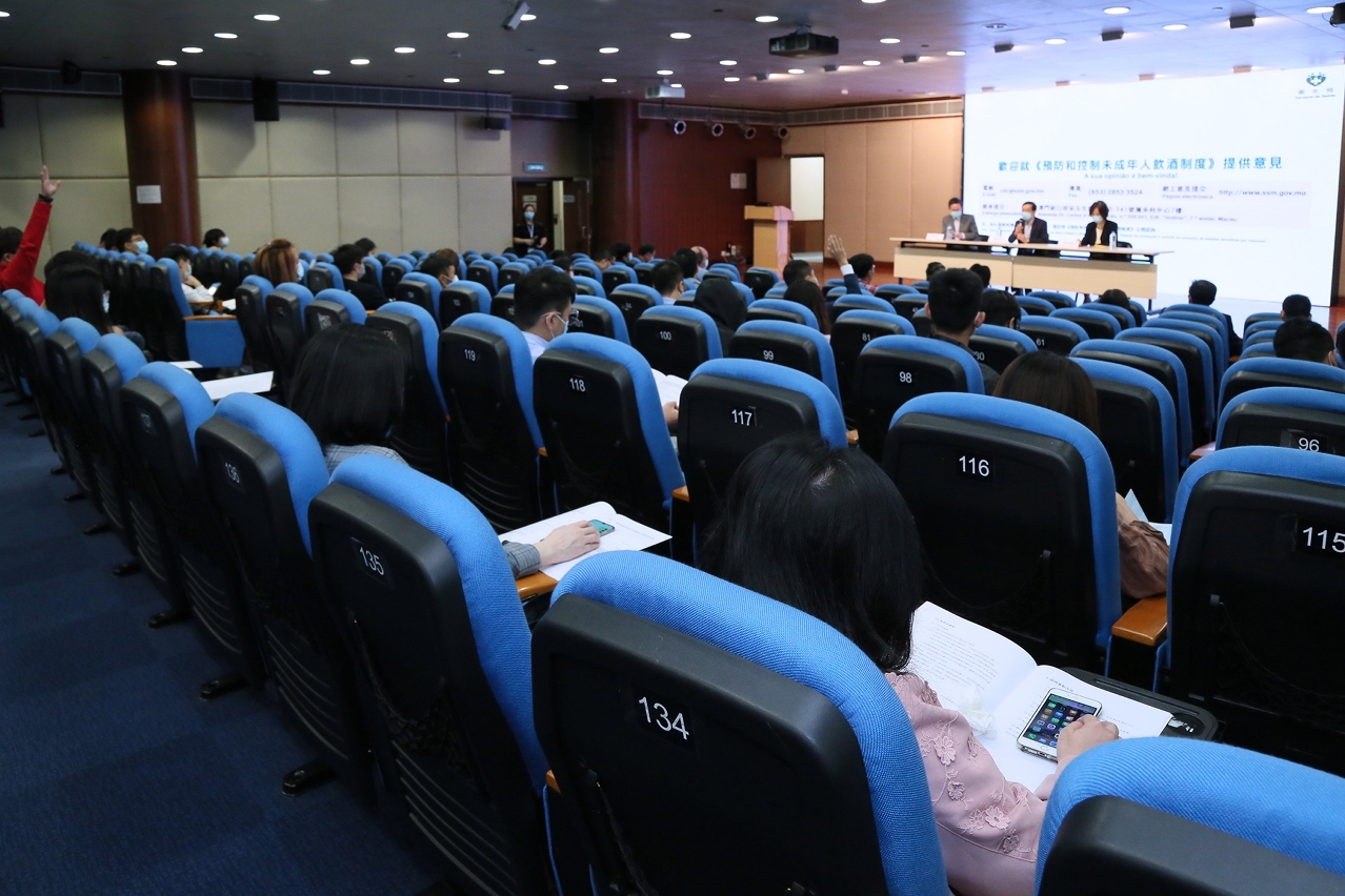 衛生局今(24)日於黑沙環衛生中心3樓演講廳舉行《預防和控制未成年人飲酒制度》第二場諮詢專場,由衛生局鄭成業副局長主持,出席代表包括:法律辦公室夏利樂協調員、疾病預防控制中心林松主任及慢性病防制暨健康促進部陳丹梅協調員、預防及控制吸煙辦公室鄧志豪主任及柯慶建顧問醫生。第二場諮詢專場為社團專場,對象為致力推廣健康促進、從事預防青少年酗酒或酒精成癮工作以青少年為服務對象的社團組織,合共21個相關團體或機構約50名代表出席參與。