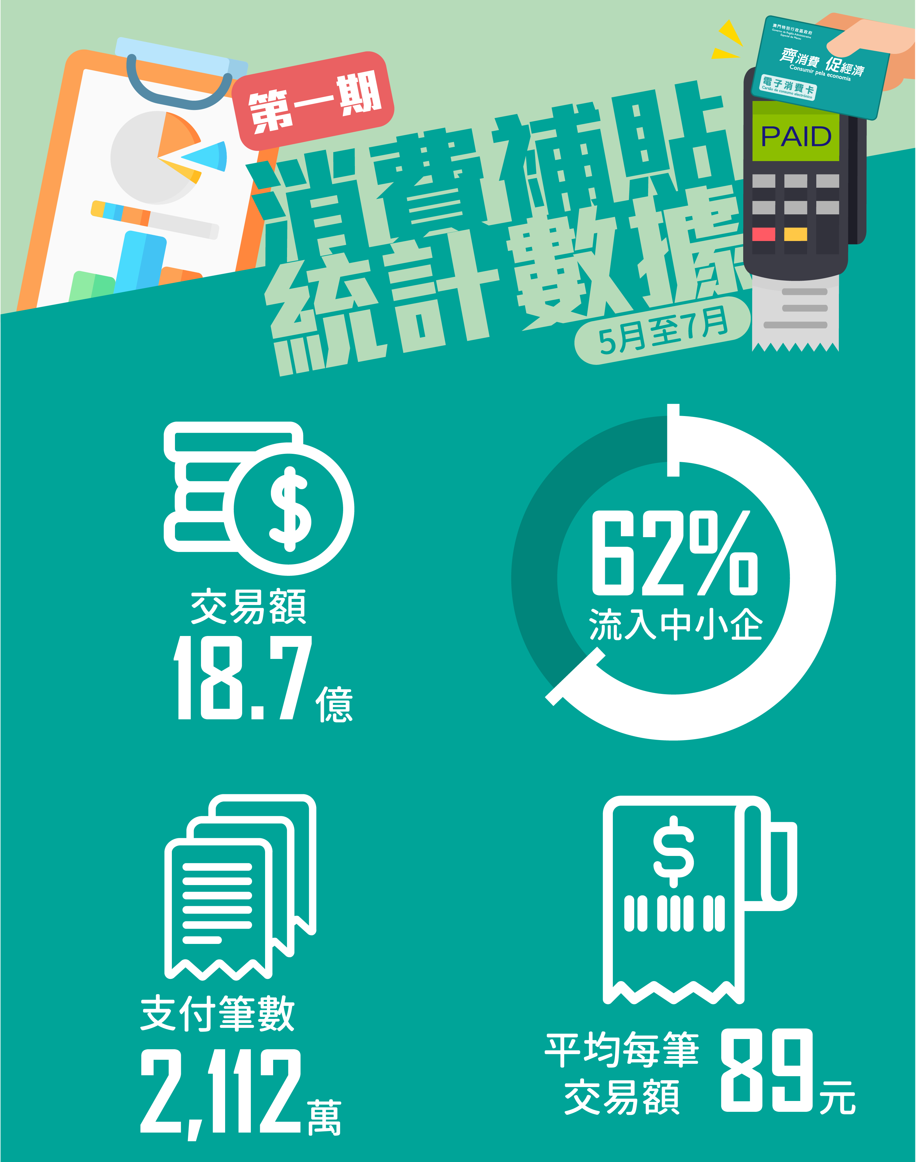 第一期消費卡使用期(5月1日至7月31日)的總交易額約為18.7億澳門元,在所有可使用電子消費卡的商戶場所中,按交易金額計算,有約62.4%的消費補貼流入中小企。