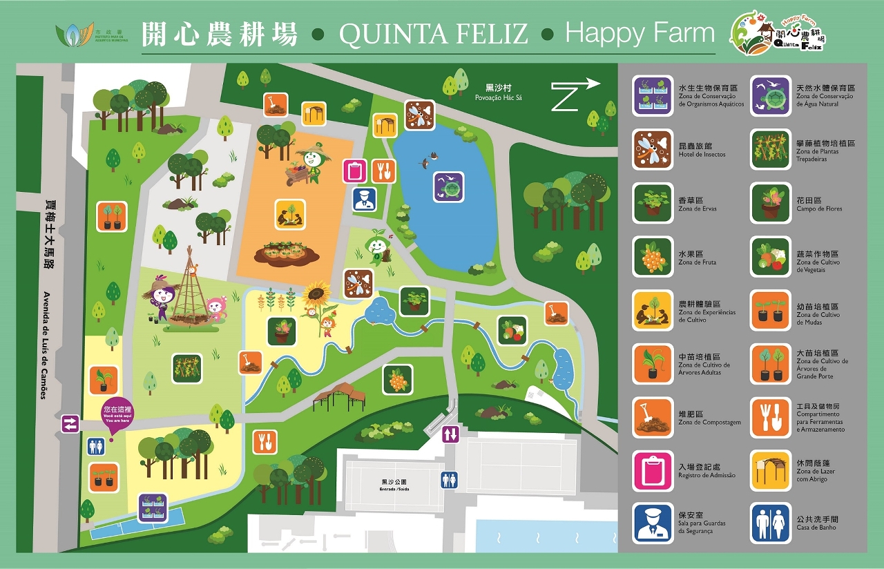 開心農耕場位於路環黑沙公園後方,市政署經檢視及整合周邊區域,將黑沙樹苗所的範圍納入其中,重整區內農圃和優化天然水塘,增加耕地由原來的七十塊至一百五十塊。優化後的黑沙開心農耕場主要分為苗圃區及農耕區,再按植物種類及功能特性細分為不同分區,向公眾介紹豐富多樣的綠化植物及農耕作物,更可體驗農耕樂趣。