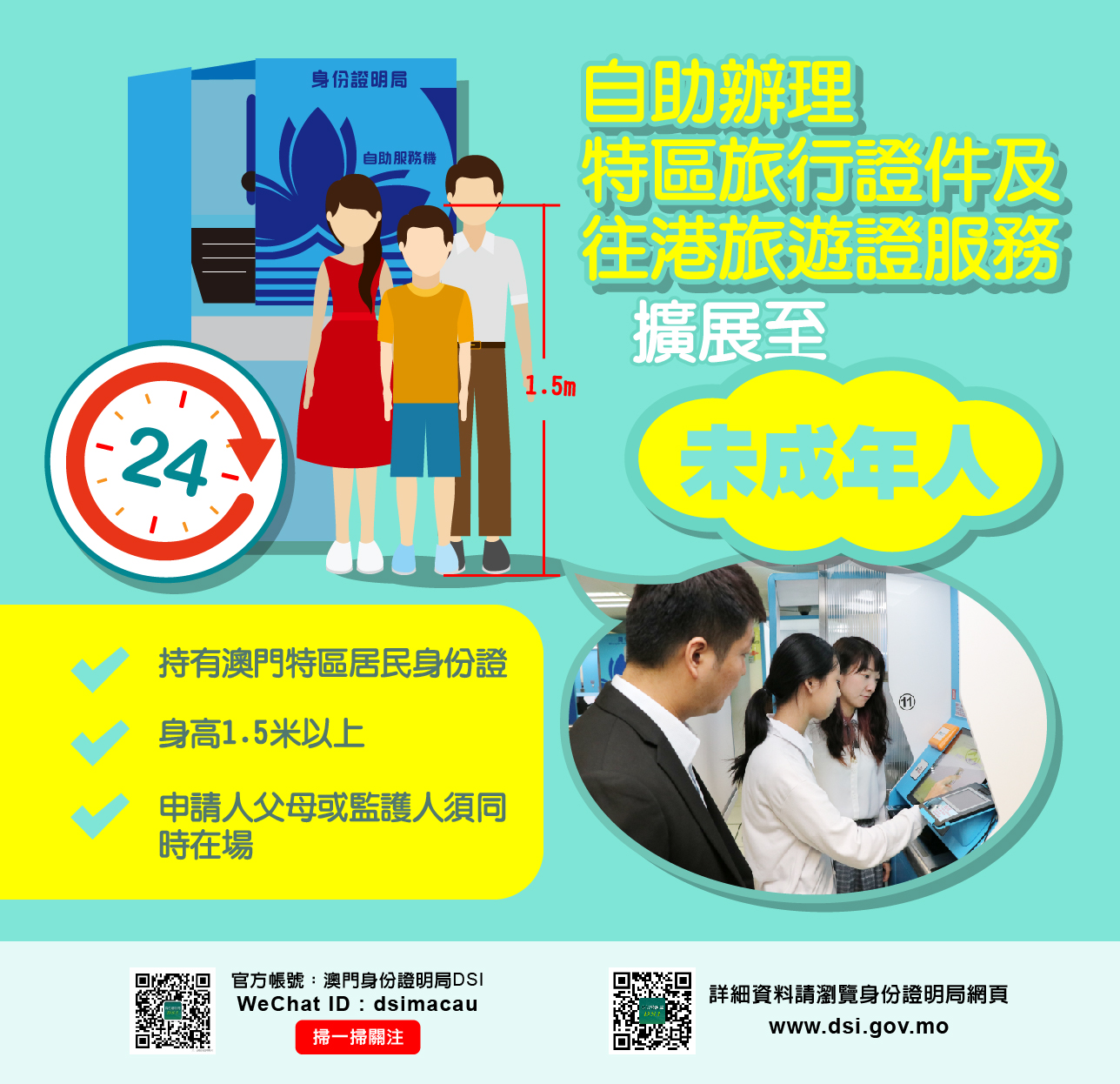 繼2019年推出網上申請特區旅行證件及往港旅遊證服務,身份證明局持續推出辦證的便民措施,讓市民可透過多種途徑提出申請。自2020年11月5日起,為方便未成年人辦理特區旅行證件及往港旅遊證,市民可透過自助服務機為符合資格的未成年子女辦理《澳門特別行政區護照》、《澳門特別行政區旅行證》及《澳門居民往來香港特別行政區旅遊證》的首次或續期申請。