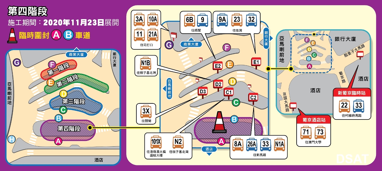 亞馬喇前地巴士站增建雨篷工程將在大賽車後恢復,即11月23日起接續餘下第四階段工程,屆時交通事務局將圍封A及B車道,原停靠該兩車道共17條巴士路線將改停靠C、D、E及G車道;此外,往澳門大學方向的71及73路線將臨時停靠“葡京酒店"站,往柯維納馬路方向的22及33路線則臨時停靠新葡京臨時站(詳見附表),交通事務局呼籲乘客留意並配合現場指示。
