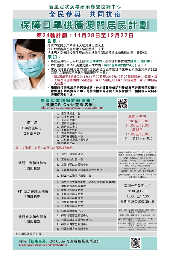 新型冠狀病毒感染應變協調中心公佈,第24輪保障口罩供應澳門居民計劃於本周六(28日)開始,售賣期間為30日,即11月28日至12月27日。