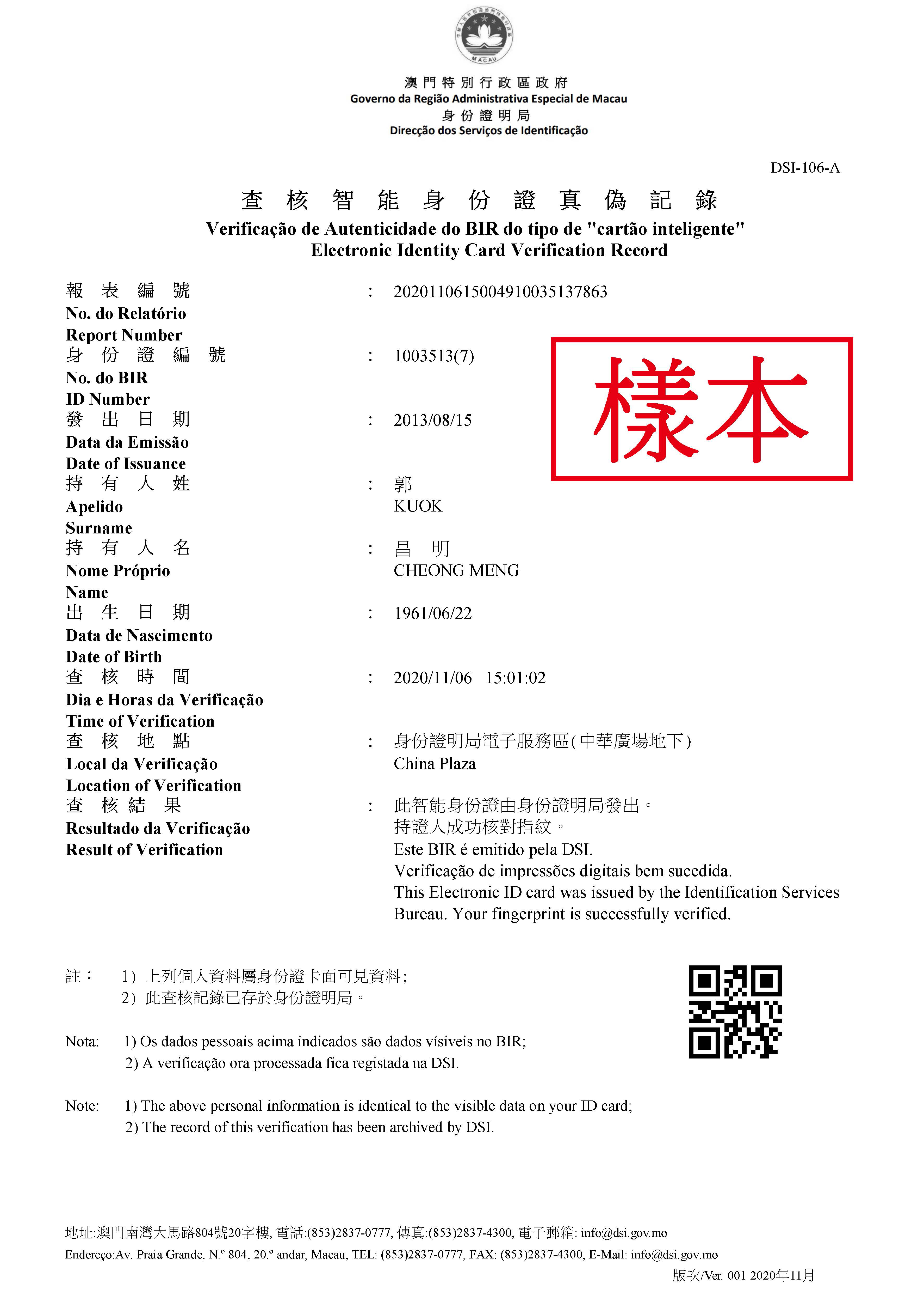 凡持有智能卡式《澳門特別行政區居民身份證》的人士,可於分佈在全澳及離島共48個服務點的多功能自助服務機使用查核智能身份證真偽的服務,在核實證件後,還可選擇列印該查核結果,費用全免。此外,有關查核結果的式樣已更新 (參見附圖)。