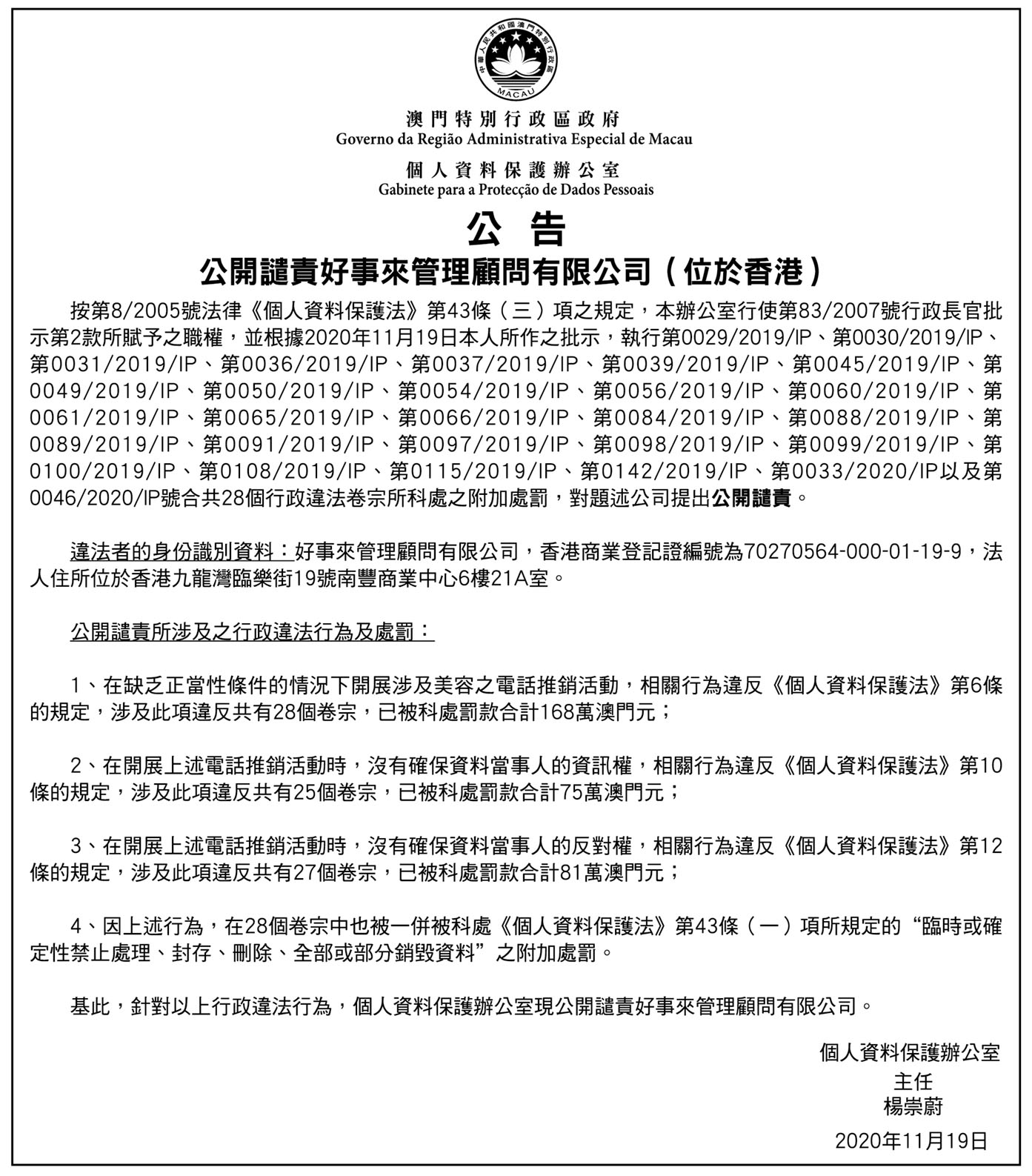 就上述事宜,個資辦今天在一份中文及一份葡文報章上刊登多份公告,分別執行多個附加處罰及提醒相關機構依法營商。