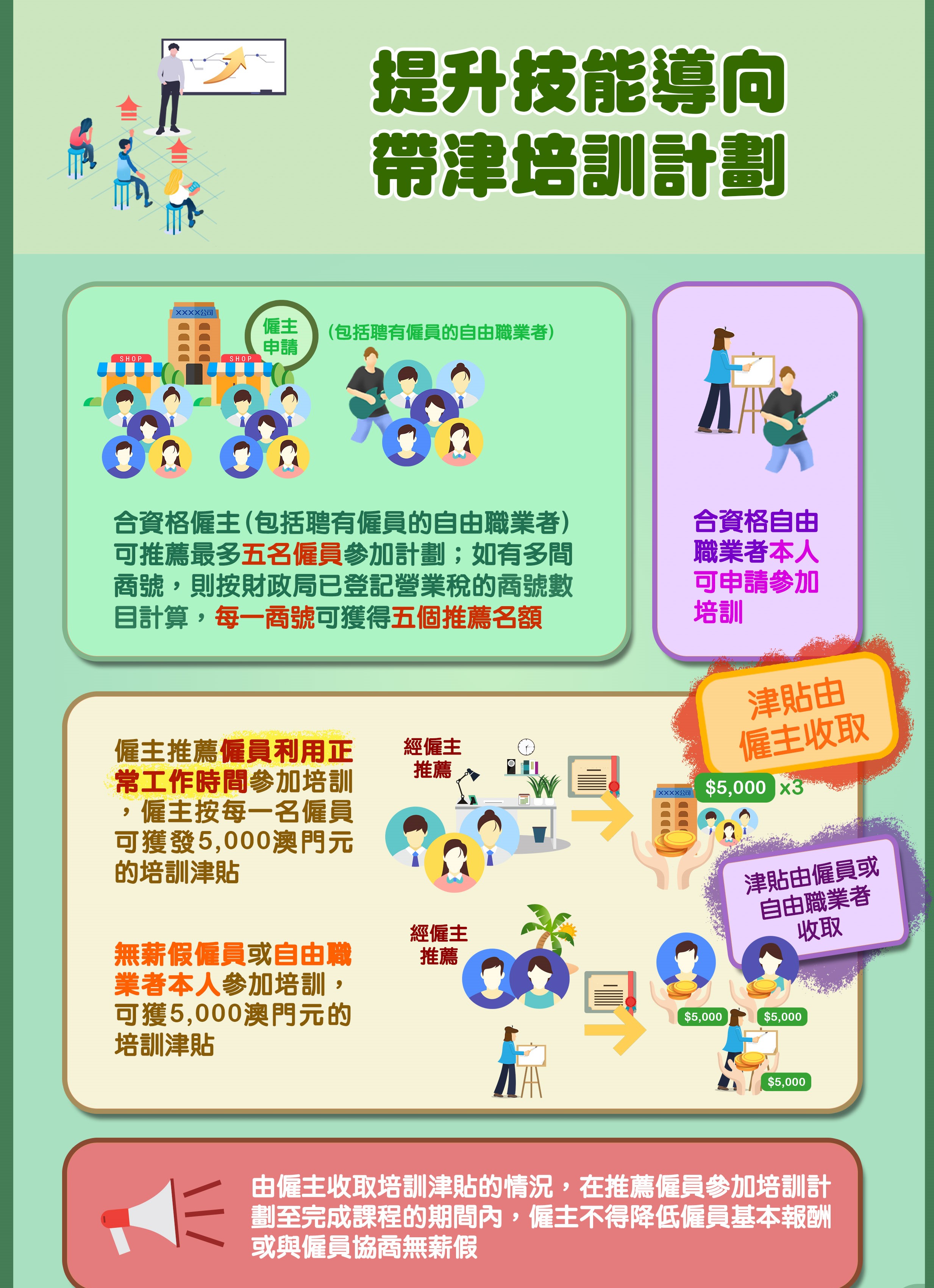 “提升技能導向帶津培訓計劃”由僱主安排其僱員在正常工作時間內參加培訓計劃,由推薦計劃至完成培訓課程期間,沒有降低相關僱員的基本報酬,亦沒有與其協商安排無薪假,按每一名完成培訓並參加考核的僱員計算,僱主可獲發放5,000澳門元的培訓津貼;如僱主安排原已處於無薪假的僱員參加培訓計劃,或自由職業者本人參加培訓計劃,則有關僱員或自由職業者於完成培訓及參加課程考核後,可獲發5,000澳門元的培訓津貼。