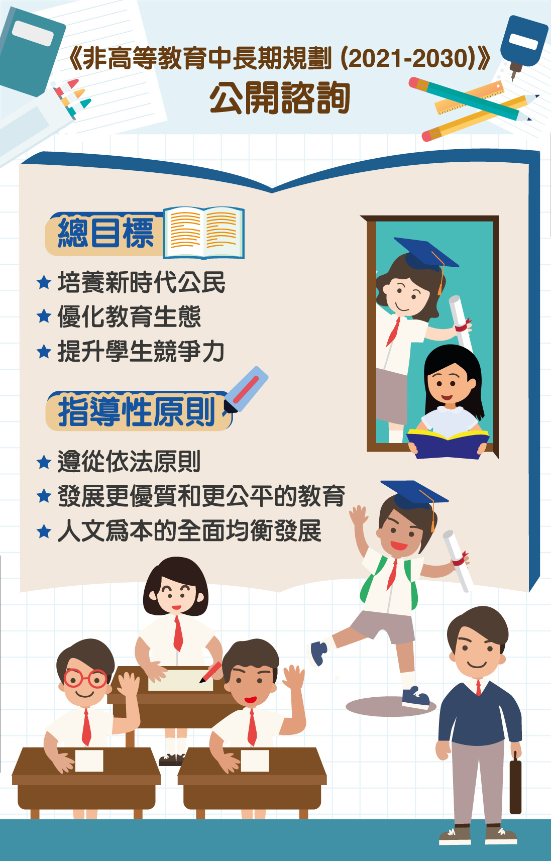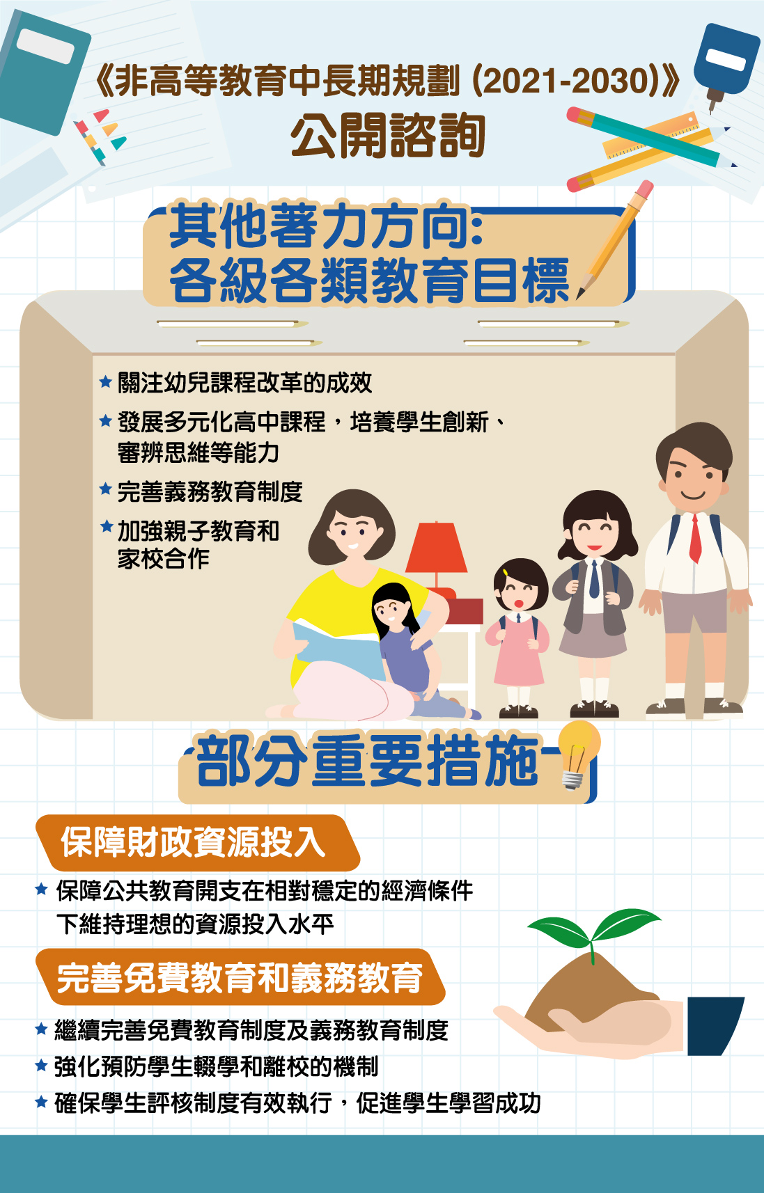新一輪的教育規劃為期十年,主要關注了未來教育事業“端正求真,務實創新”的願景,以“培養新時代公民”、“優化教育生態”、“提升學生競爭力”為總目標,提出四個重點發展方向,包括“培養家國情懷與國際視野”、“發展學生軟實力”、“提升幸福感”、“加強創意與科技教育”;以及幼兒、小學、初中、高中教育、職業技術教育、特殊教育、持續教育等各級各類教育的發展目標。另外,還提出支持各項目標的重要措施,包括:保障財政資源投入,完善免費教育,優化教師隊伍建設,建設優質校園環境,優化學校系統,持續推進課程、教學與評核改革,促進學生安全和身心健康,完善終身學習體系,加強教育區域合作。