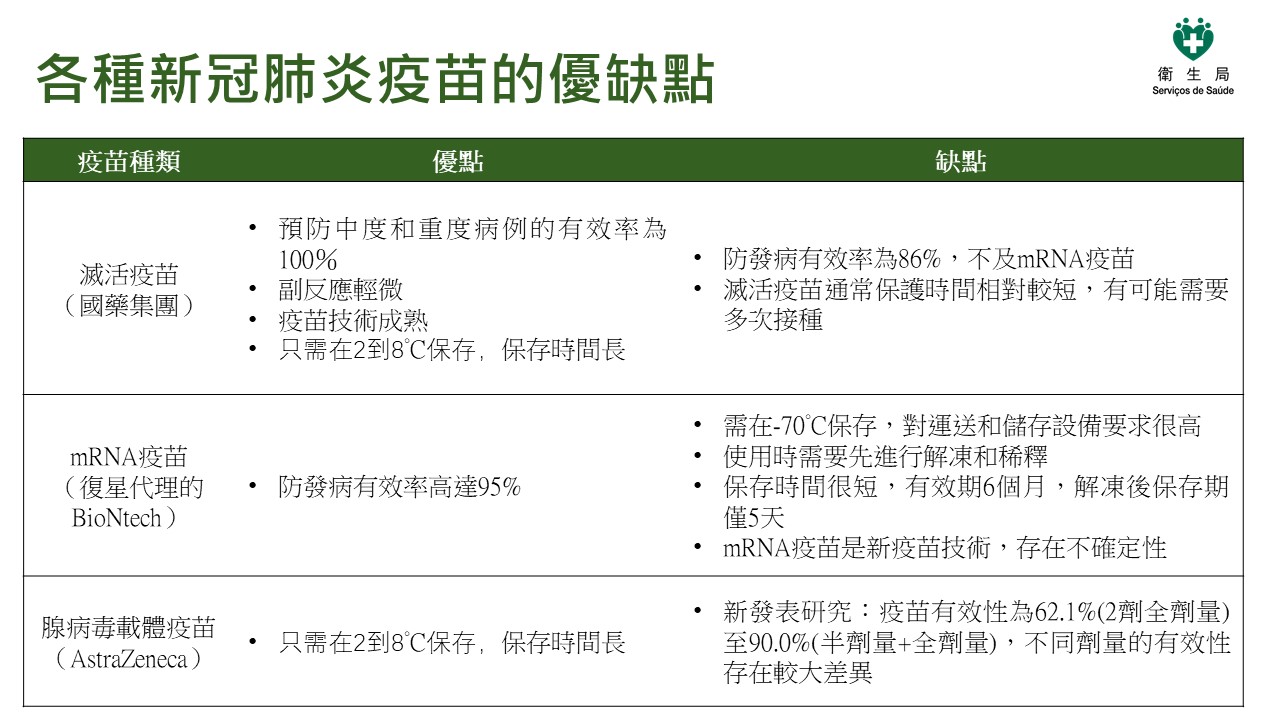 政府計劃購入三種來自不同產地的疫苗,各採購40萬劑(不包括GAVI計劃的20萬劑),並將分批供應到澳門。當中,產地為北京、國藥集團供應的滅活疫苗,預計交貨期首批在第一季;產地為德國、法國或比利時、復星代理的BioNtech mRNA疫苗,預計交貨期首批在第一季;產地待定、AstraZeneca代理的腺病毒載體疫苗,預計交貨期首批在第二季。政府會持續留意世界各地有關疫苗接觸情況,以及監察不良事件等。